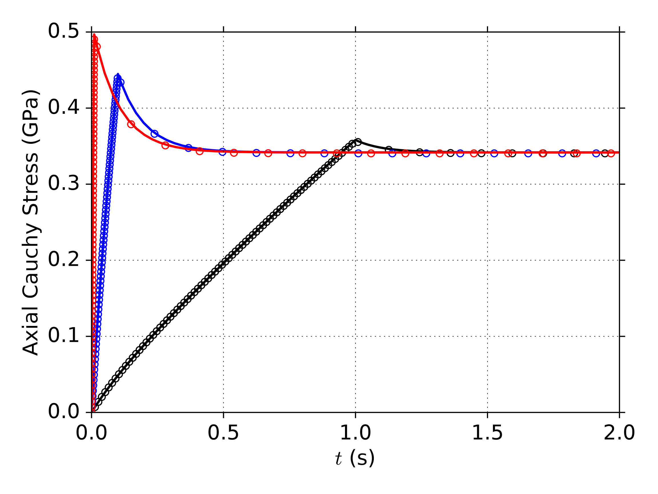The second verification problem considered is uniaxial strain under isothermal conditions wherein the non-linear clock terms are set to zero (\(C_3 = 0\) and \(C_4 = 0\)). Here, the temperature is set to the reference temperature, \(\theta = \theta_{\text{ref}}\), and a two stage boundary value problem is simulated. A material point (single 8-node hexahedral element with selective deviatoric spatial integration) is loaded at a constant logarithmic strain rate in uniaxial strain up to a prescribed logarithmic strain (characterized by a loading time, \(t_{\text{L}}\)). Then, the logarithmic strain rate is fixed to zero. The stress responses in the axial and transverse directions are output over time during this load and hold process. Three logarithmic strain rates are considered: 0.001, 1, and 1000 per second which activate the rubbery, mixed, and glassy responses respectively. For all three cases, the specimen is loaded to 10% axial logarithmic strain, and then the specimen is held for 10 seconds. Uniaxial strain involves finite volume and shape change, and so this boundary value problem tests both relaxation processes simultaneously.