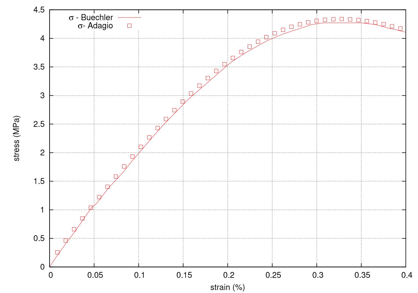 The results of the analysis are shown in Fig. 4.151. The axial stress increases linearly and then begins to soften due to the accumulation of damage as crack growth occurs. The simulation is for the curve corresponding to the time step \(\Delta t = 0.0625\) s in the journal article. The Adagio implementation shows agreement with the journal implementation.