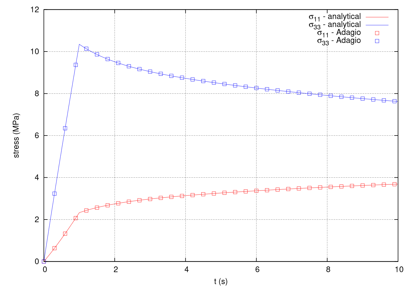 The axial stress \(\sigma_{33}\) increases nearly linearly until the end of the ramp loading, \(t_L = 1\) s, and then relaxes as the displacement is held fixed. Similarly, the stresses \(\sigma_{11} = \sigma_{22}\) increase linearly during ramp loading and then continue to increase as the axial stress relaxes. The Adagio solution shows agreement with the analytical solutions.