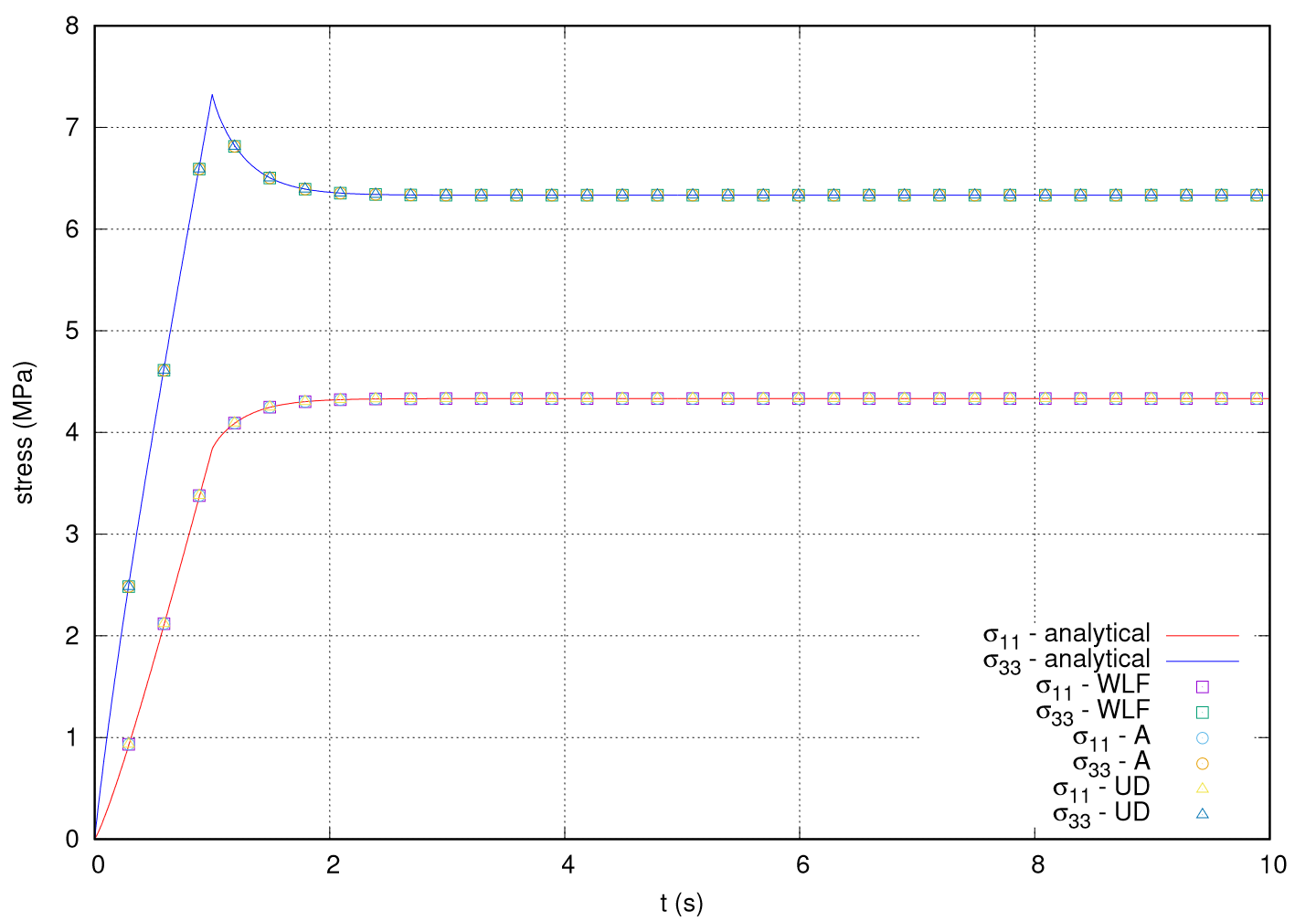 Here, the relaxation times are \(\tau^{(\kappa)} = a_T(T_{n+1}) \tau^{(\kappa)}_{ref}\). These times are updated at the start of the time step by computing the shift factor at the new temperature \(T_{n+1}\) and then shifting the reference relaxation times.
