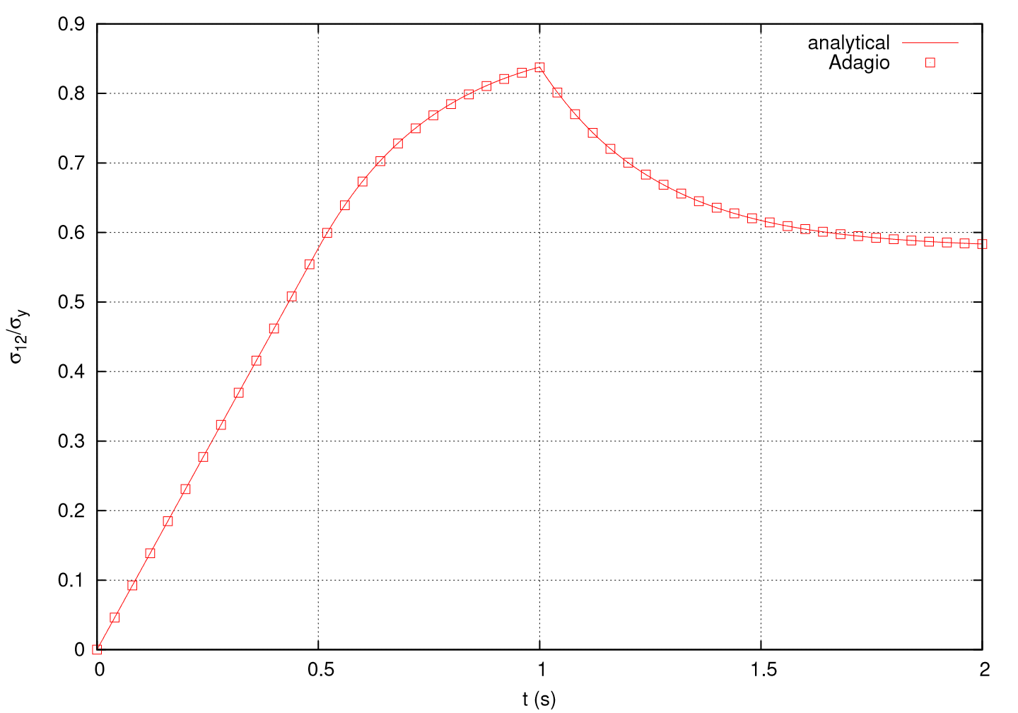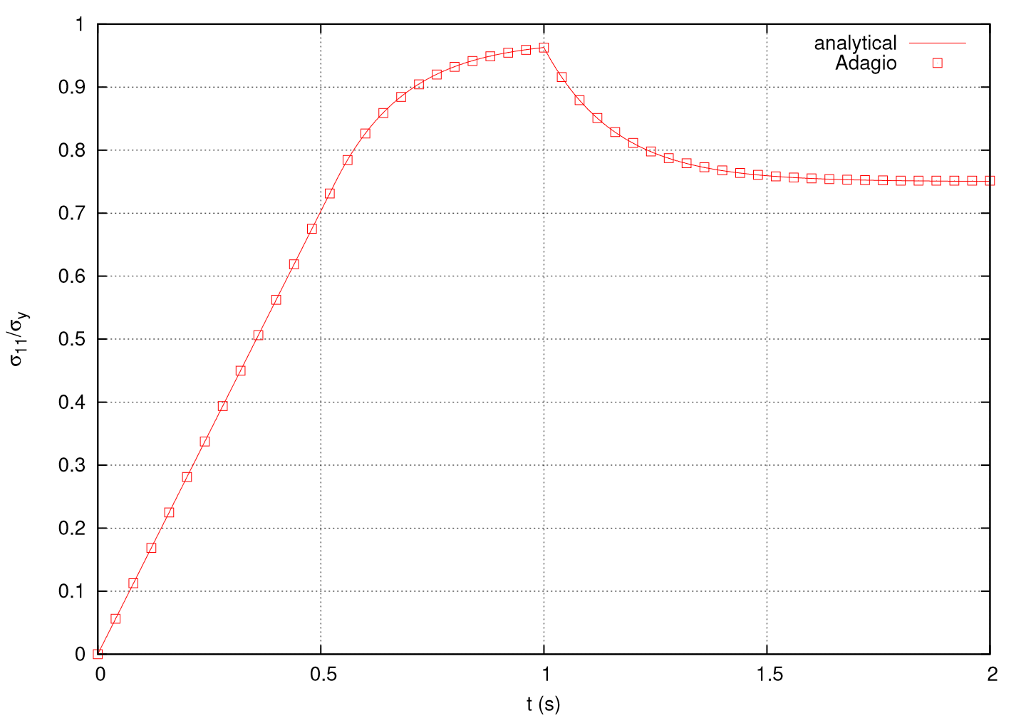 The results of the analysis, using the implicit solution scheme with a timestep of \(\Delta t = 0.025\) s, are shown in Fig. 4.152. The Adagio solition shows agreement with the analytical solution.