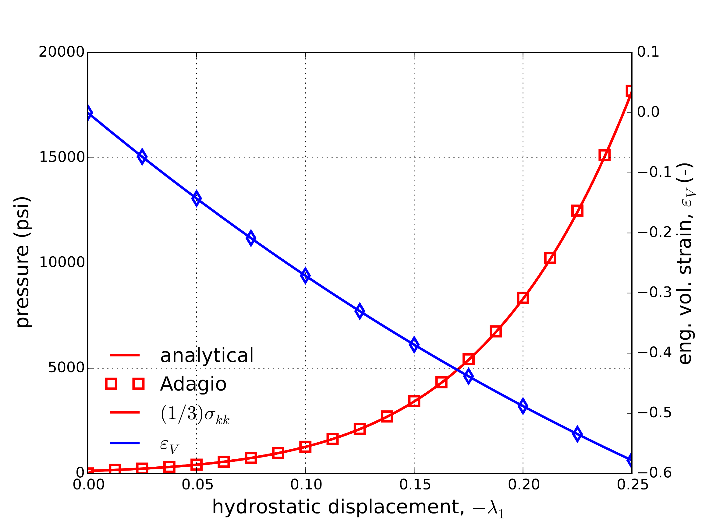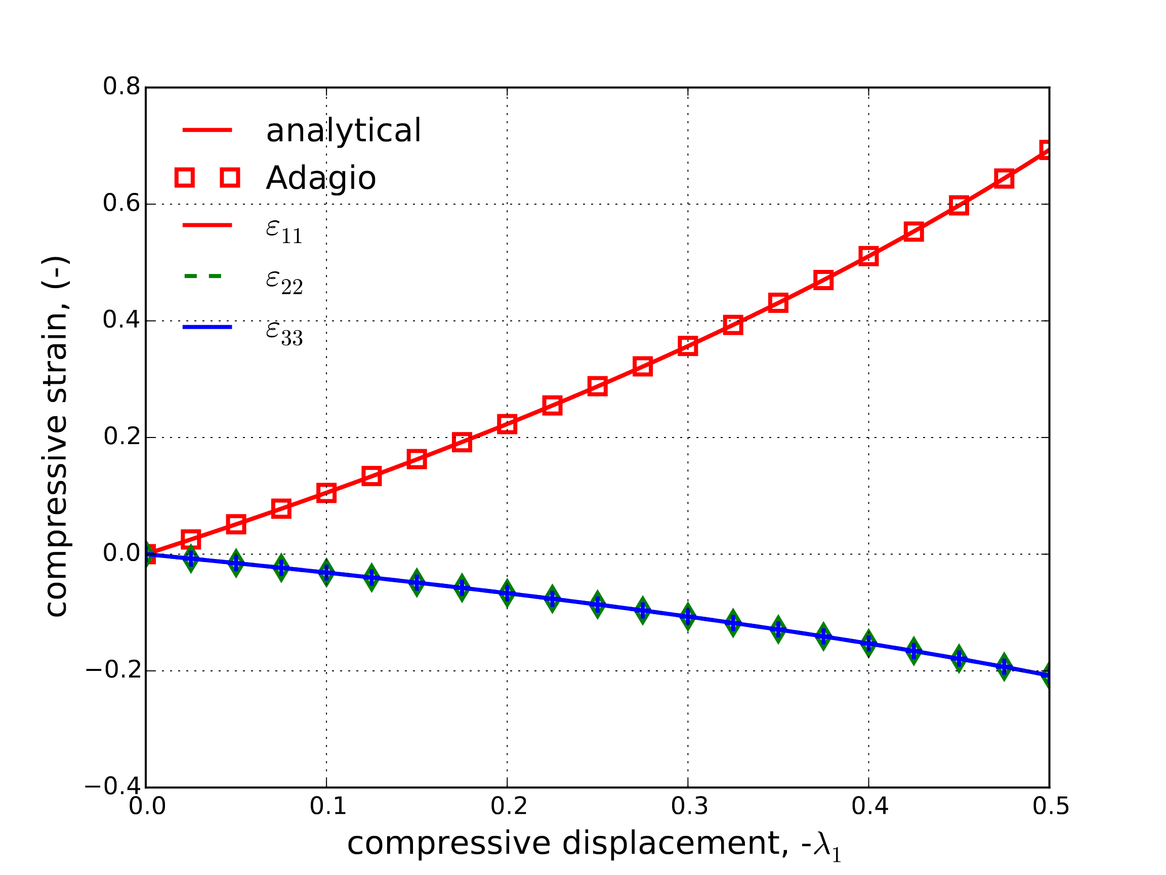 The analytical and numerical solution (from adagio) of this problem are presented in Fig. 4.145 with the stress and strains given in Fig. 4.145(a) and Fig. 4.145(b), respectively. Excellent agreement is observed verifying the compressive hardening performance.