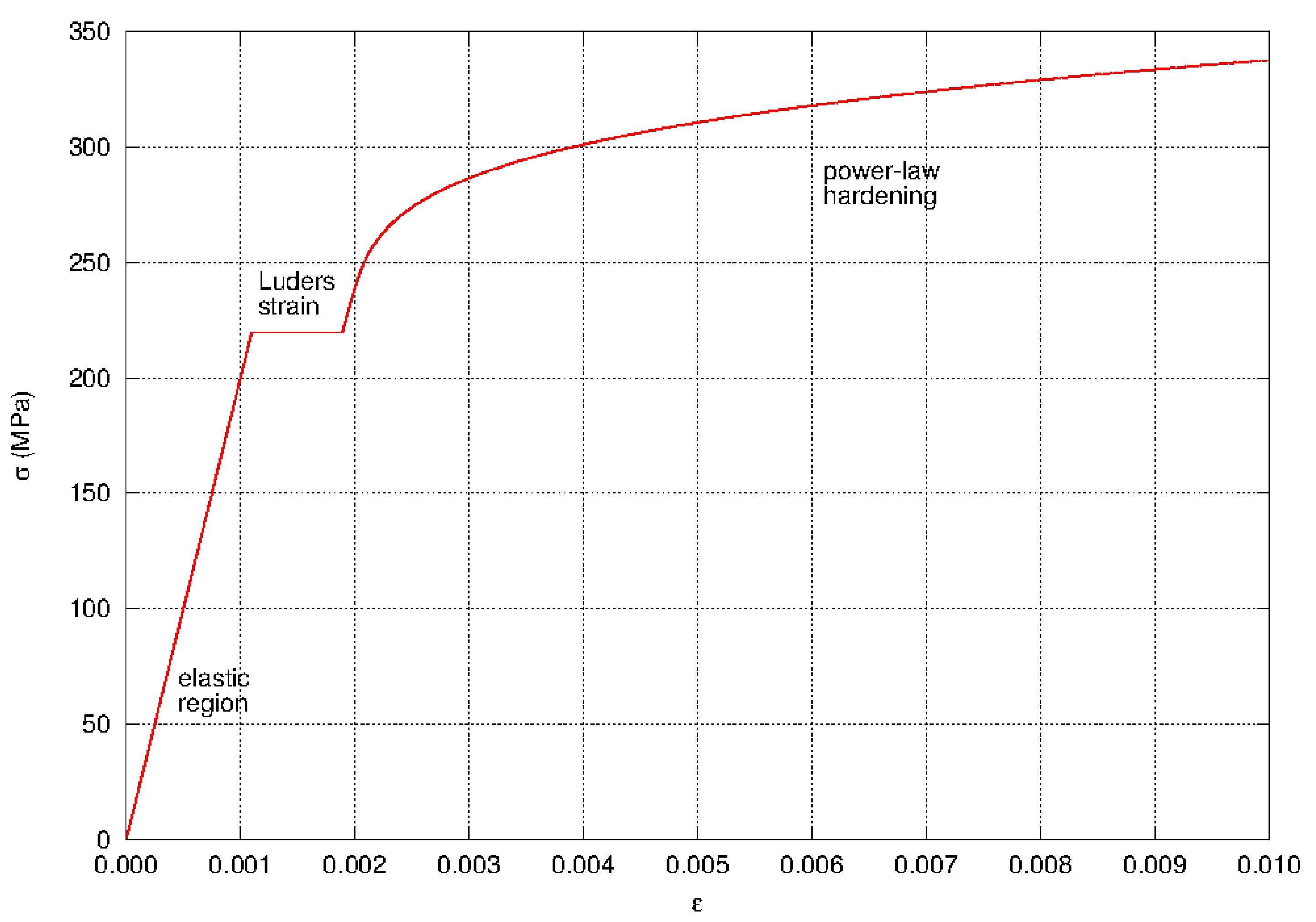 which is shown in Fig. 4.20. The yield stress is \(\sigma_{y}\), the hardening constant is \(A\), the hardening exponent is \(n\), and the Lüders strain is \(\varepsilon_{L}\). The bracket \(<\cdot>\) is the Macaulay bracket defined as