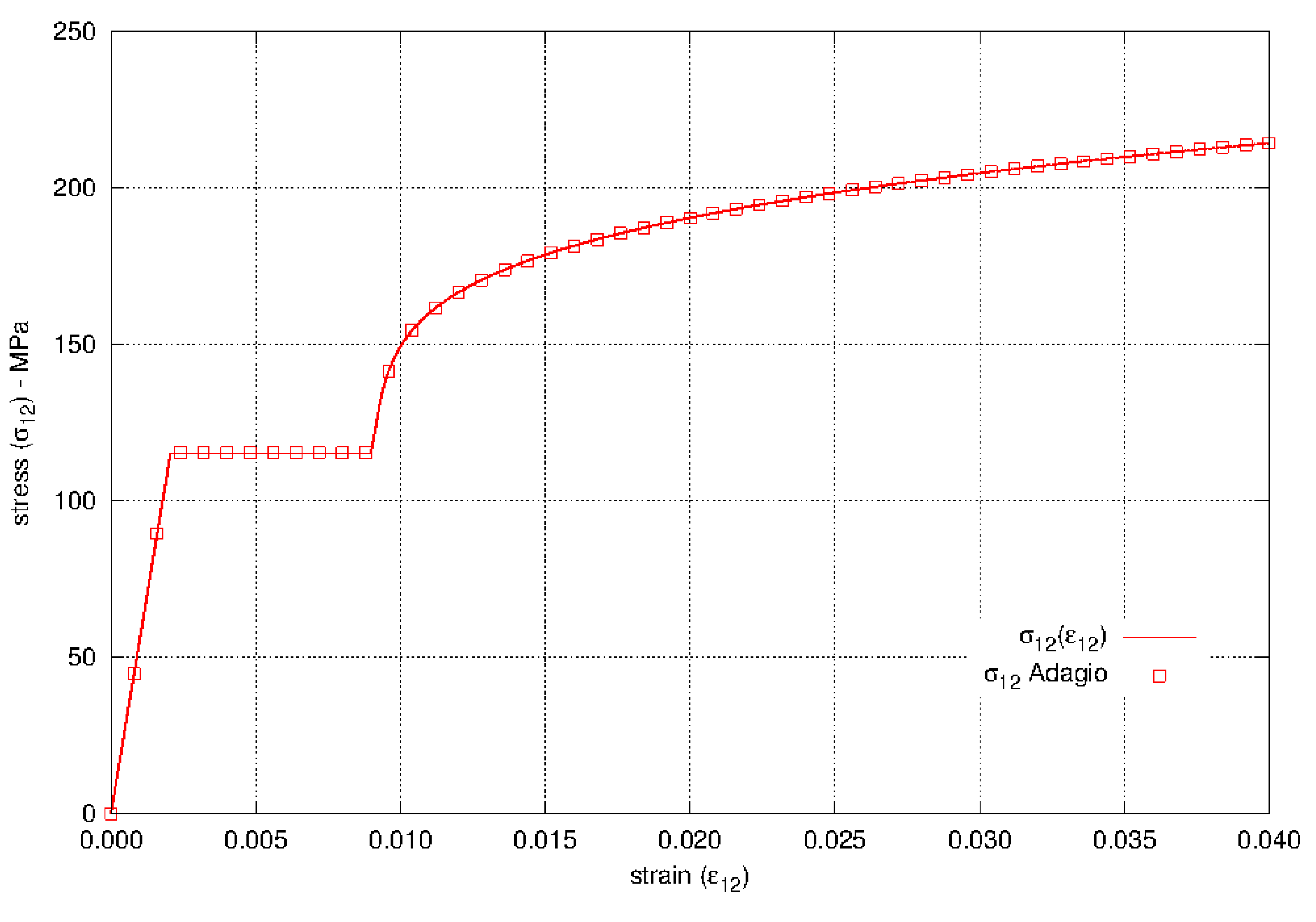 The elastic-plastic power-law hardening model is tested in pure shear. The test looks at the shear stress as a function of the shear strain and compares these values against analytical results for the same problem. For the pure shear problem, the only non-zero strain component is \(\varepsilon_{12}\) and the only non-zero stress component is \(\sigma_{12}\).