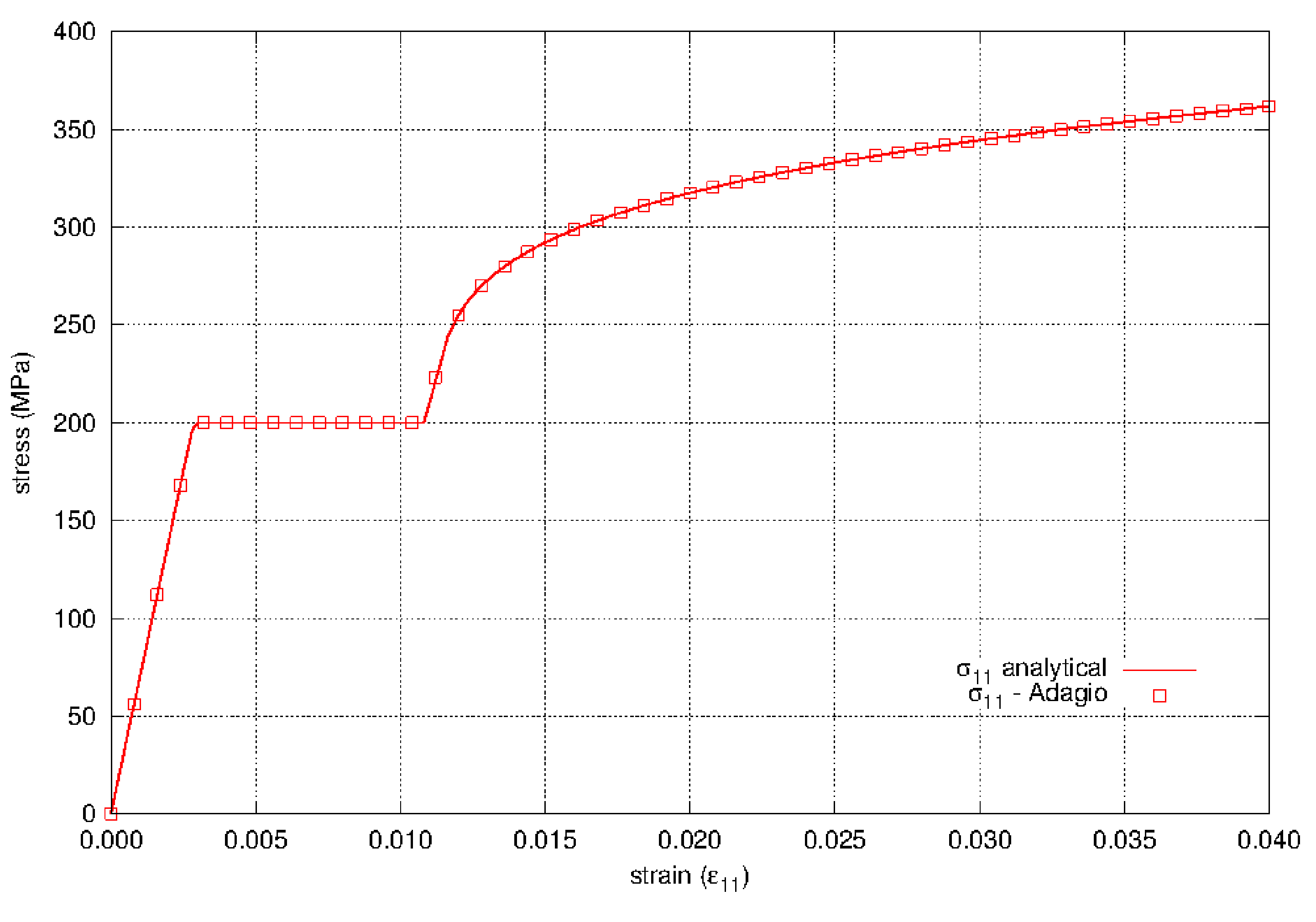 The elastic-plastic power-law hardening model is tested in uniaxial tension. The test looks at the axial stress and the lateral strain and compares these values against analytical results for the same problem. In this verification problem only the normal strains/stresses are needed, and the shear terms are not exercised.