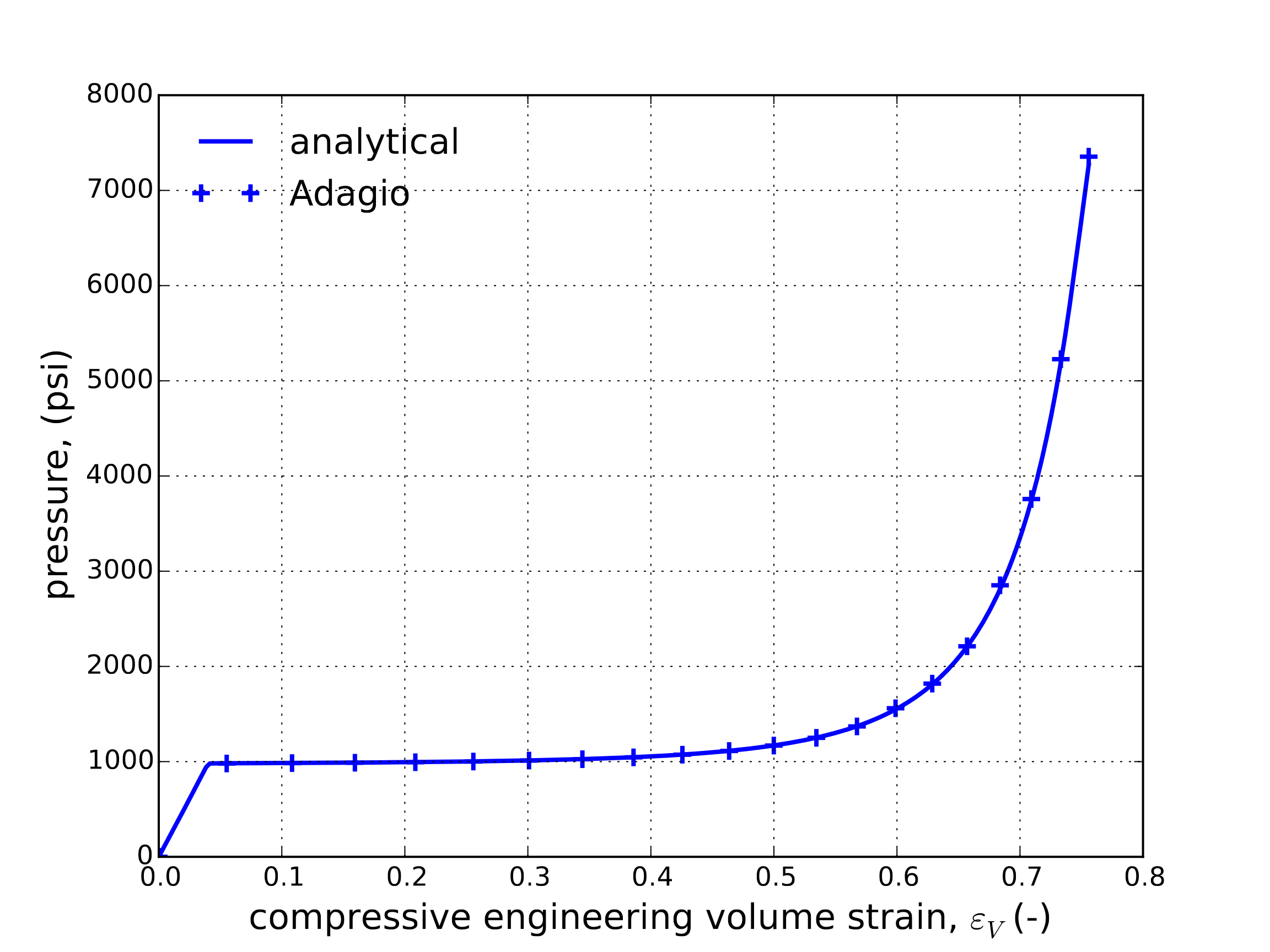 The elastic strains then reduce to \(\varepsilon^{\text{e}}_{ij}=-\frac{p}{3K}\delta_{ij}\) and the plastic strains computed as \(\varepsilon^{\text{p}}_{ij}=\left(\ln\left(1+\lambda\right)+\frac{p}{3K}\right)\delta_{ij}\). The resulting engineering strain vs. pressure results determined numerically and analytically are presented in Fig. 4.123.