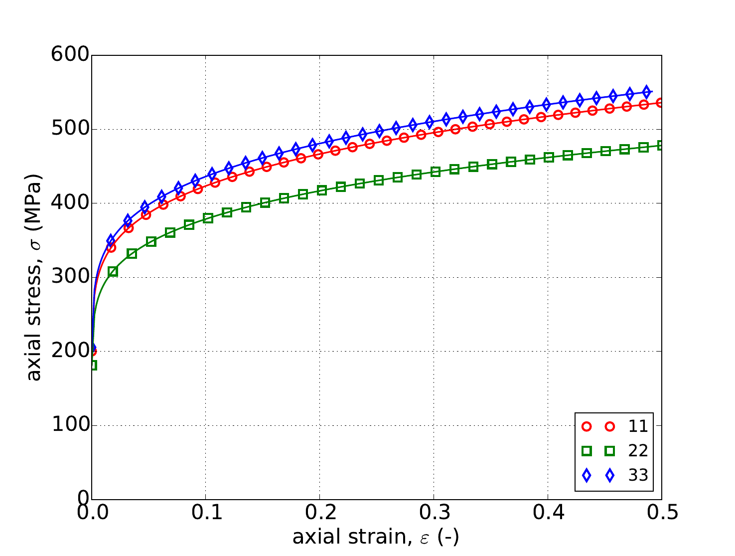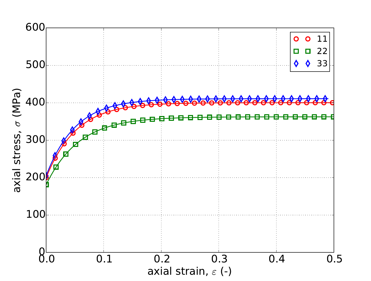 Fig. 4.59 Stresses when loading in the \(e_{1}\), \(e_{2}\), and \(e_{3}\)-directions using the Hill model with a Voce hardening law.
