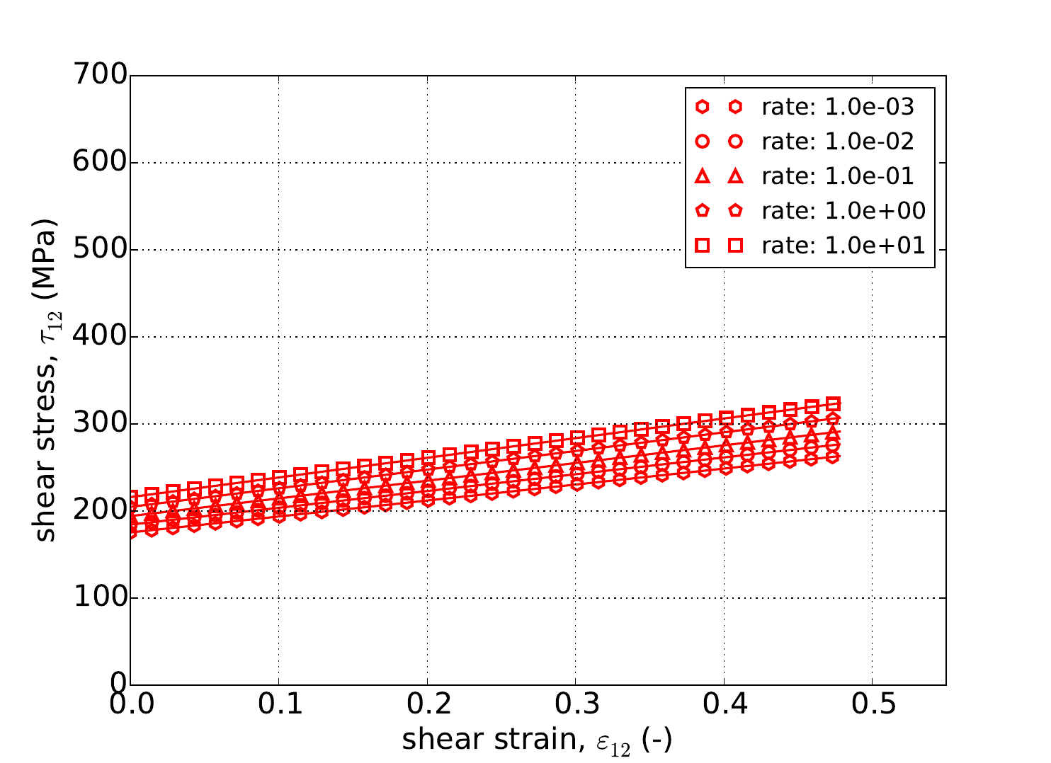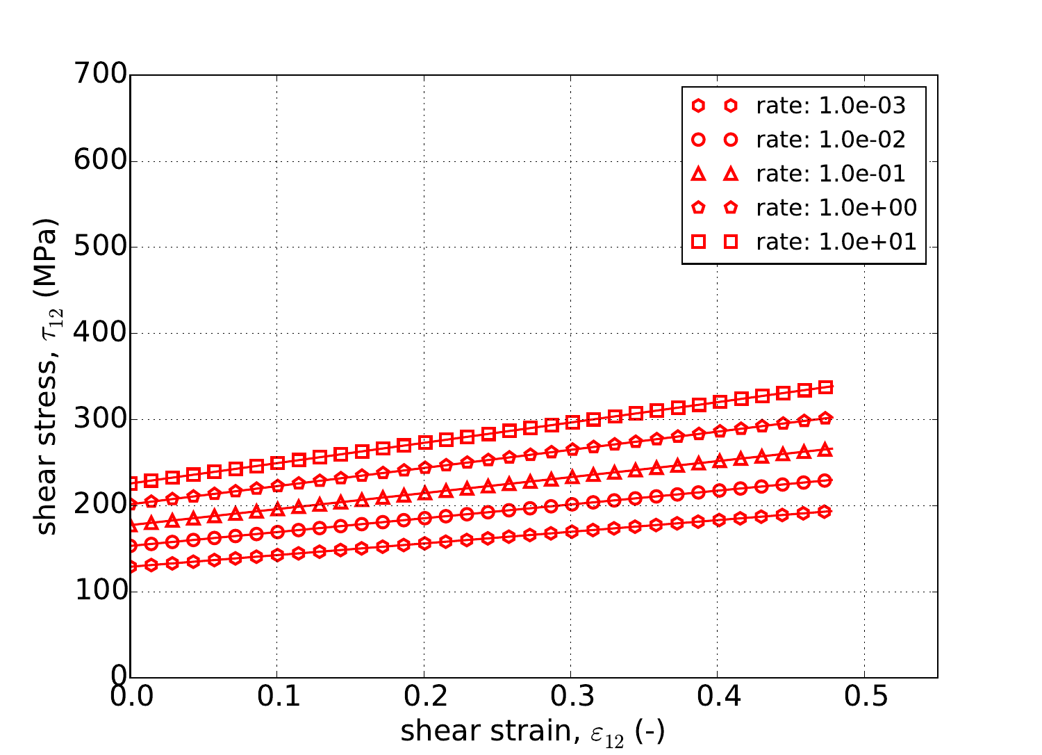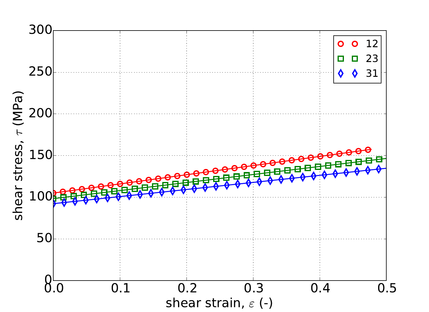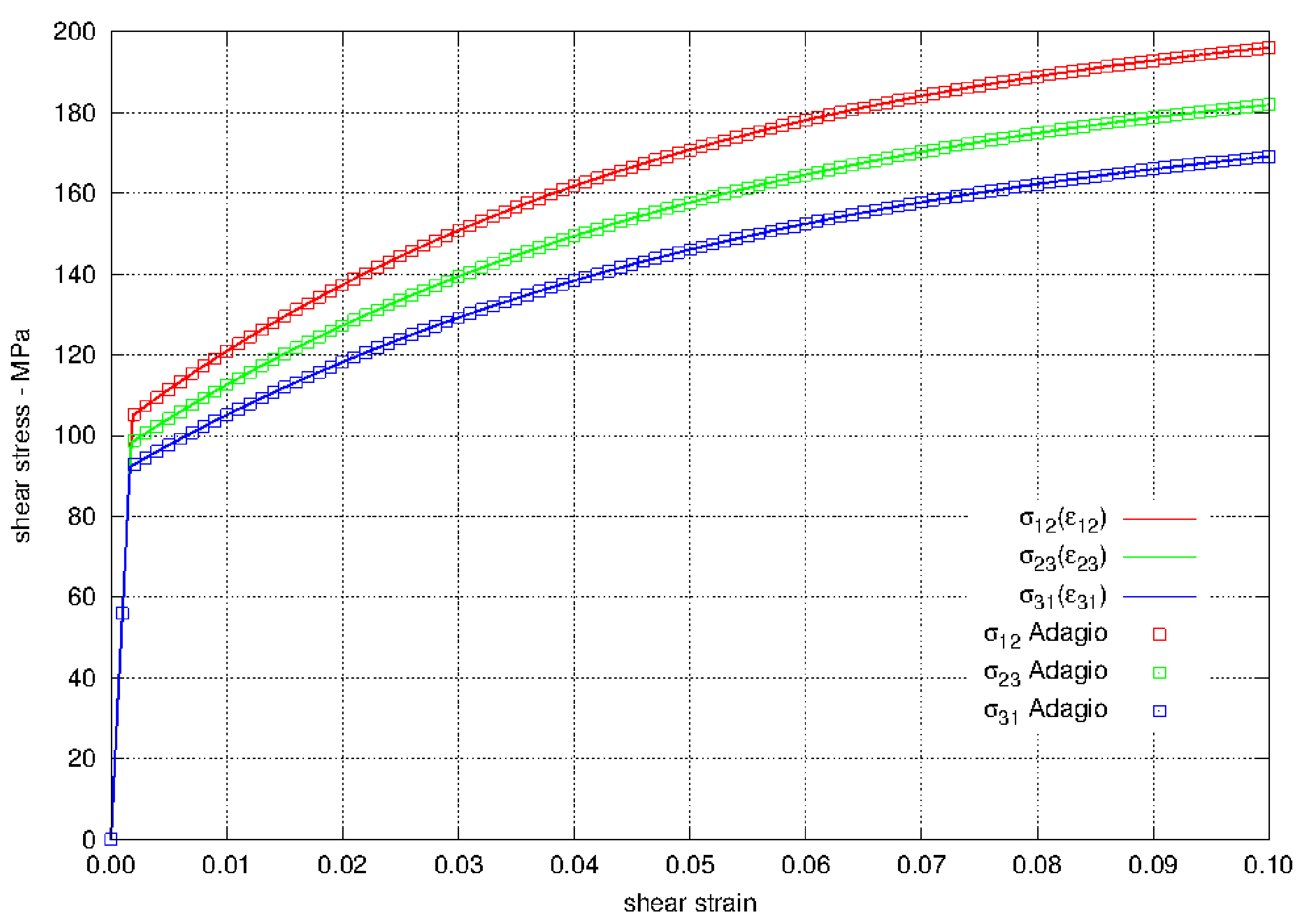 The shear stress calculated by the Hill plasticity model in Adagio is compared to analytical solutions. Without loss of generality we will look at solutions for pure shear with respect to the \(e_{1}\)-\(e_{2}\) axes. Solutions for shear with respect to the other axes will be similar. In what follows, the only non-zero shear stress will be \(\sigma_{12}\), and the only non-zero shear strain will be \(\varepsilon_{12}\) In general, for pure shear with respect to the \(e_{1}\)-\(e_{2}\) axes, the effective stress is