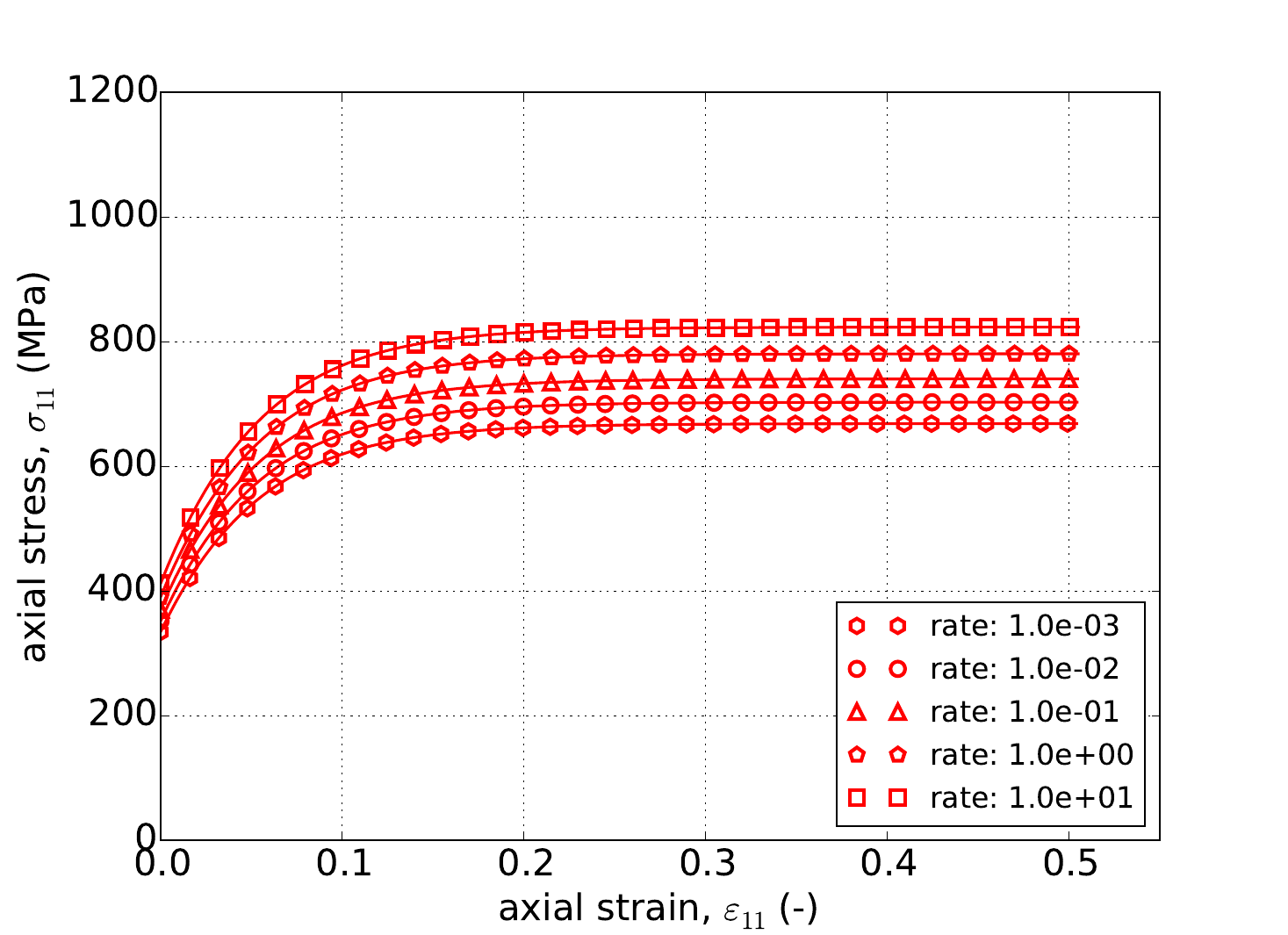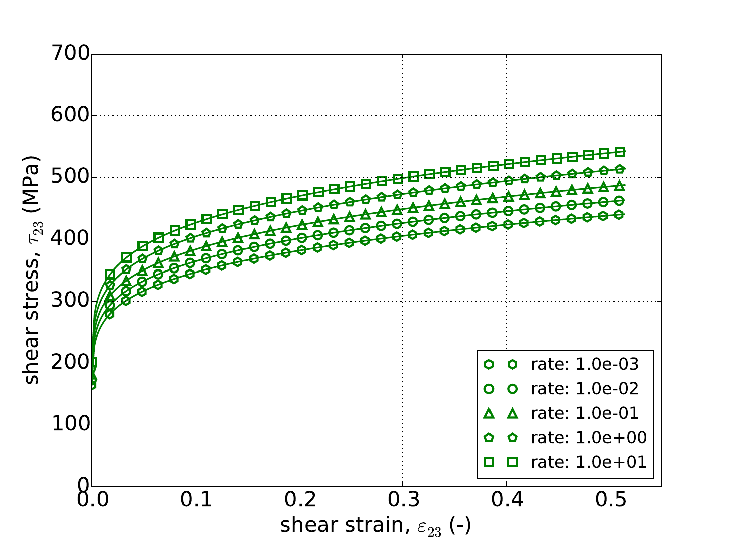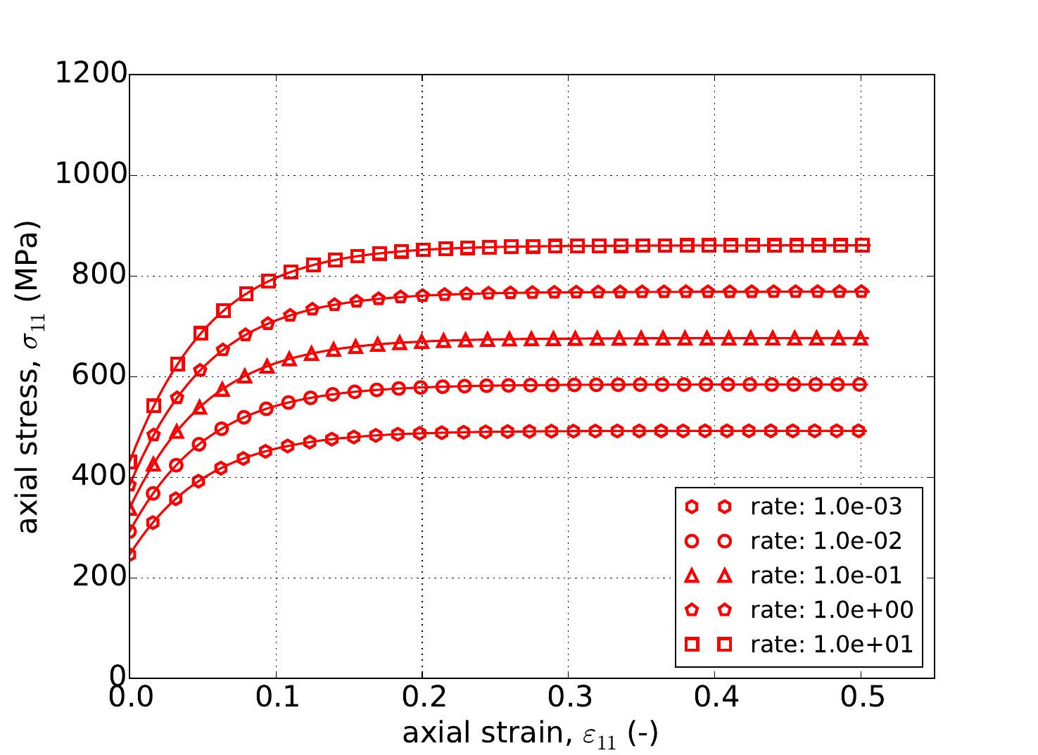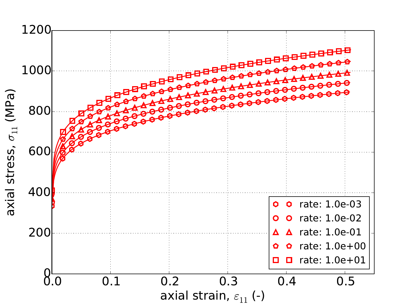 with \(\tilde{\sigma}_y\left(\bar{\varepsilon}^p\right)\) being the user supplied rate independent expression, \(g\) is a model parameter related to the activation energy required to transition from climb to glide-controlled deformation, and \(m\) dictates the strength of the dependence.