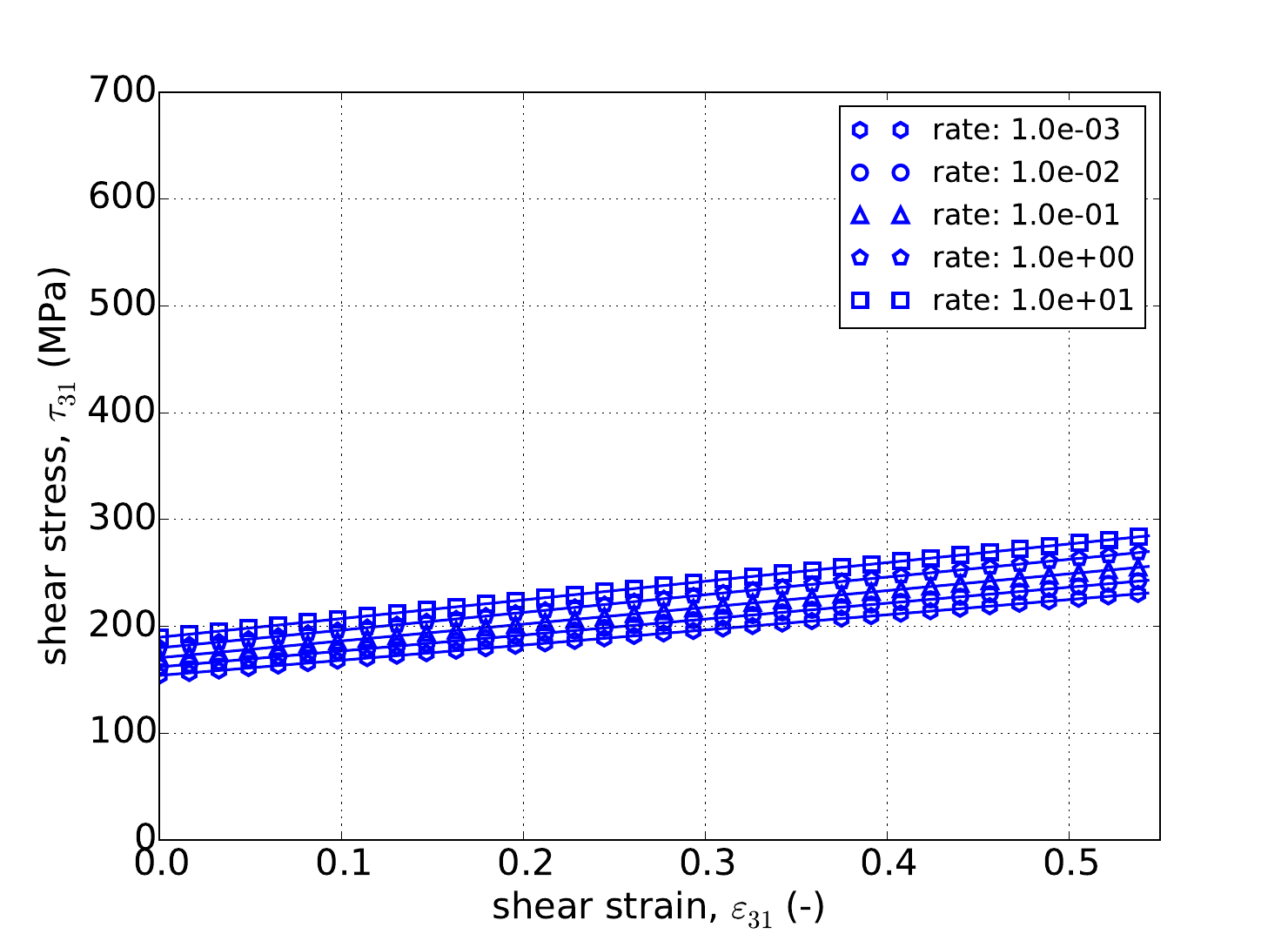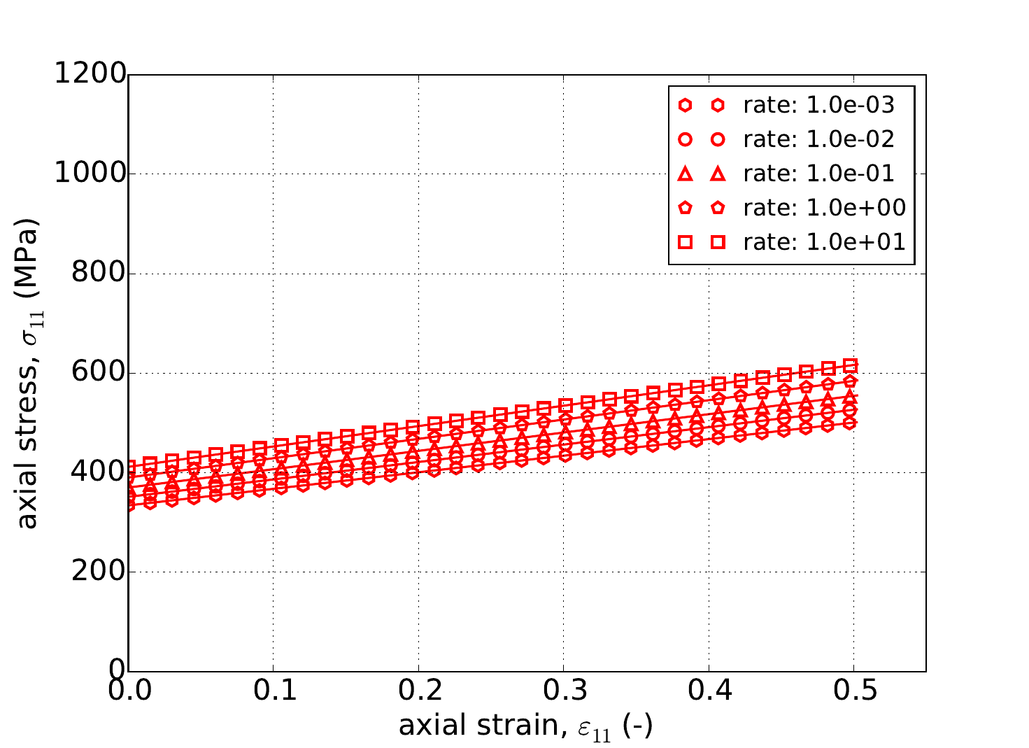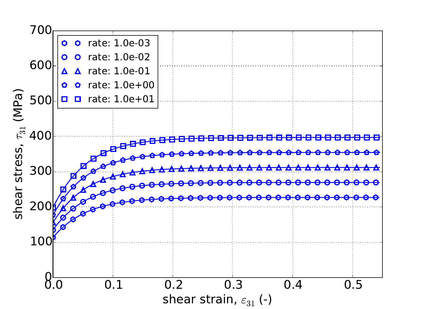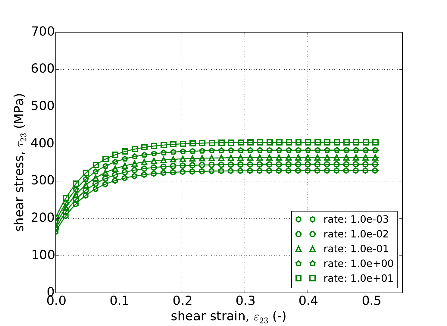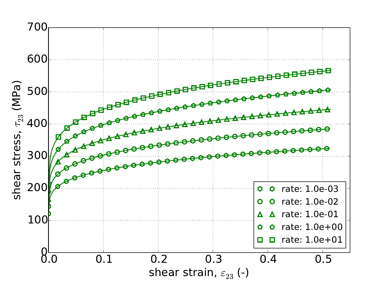 with \(\tilde{\sigma}_y\left(\bar{\varepsilon}^p\right)\) being the user supplied rate independent expression, \(g\) is a model parameter related to the activation energy required to transition from climb to glide-controlled deformation, and \(m\) dictates the strength of the dependence.
