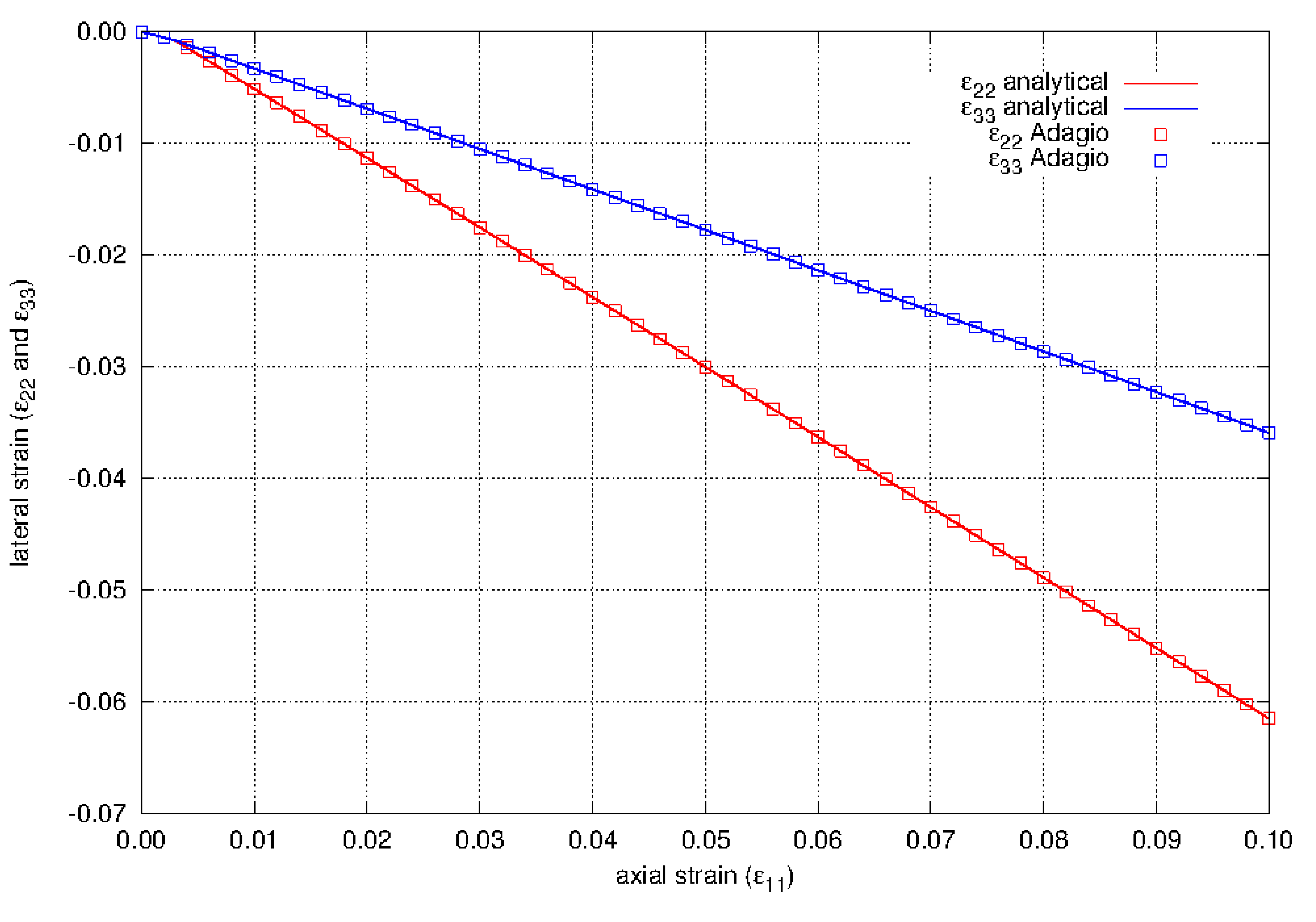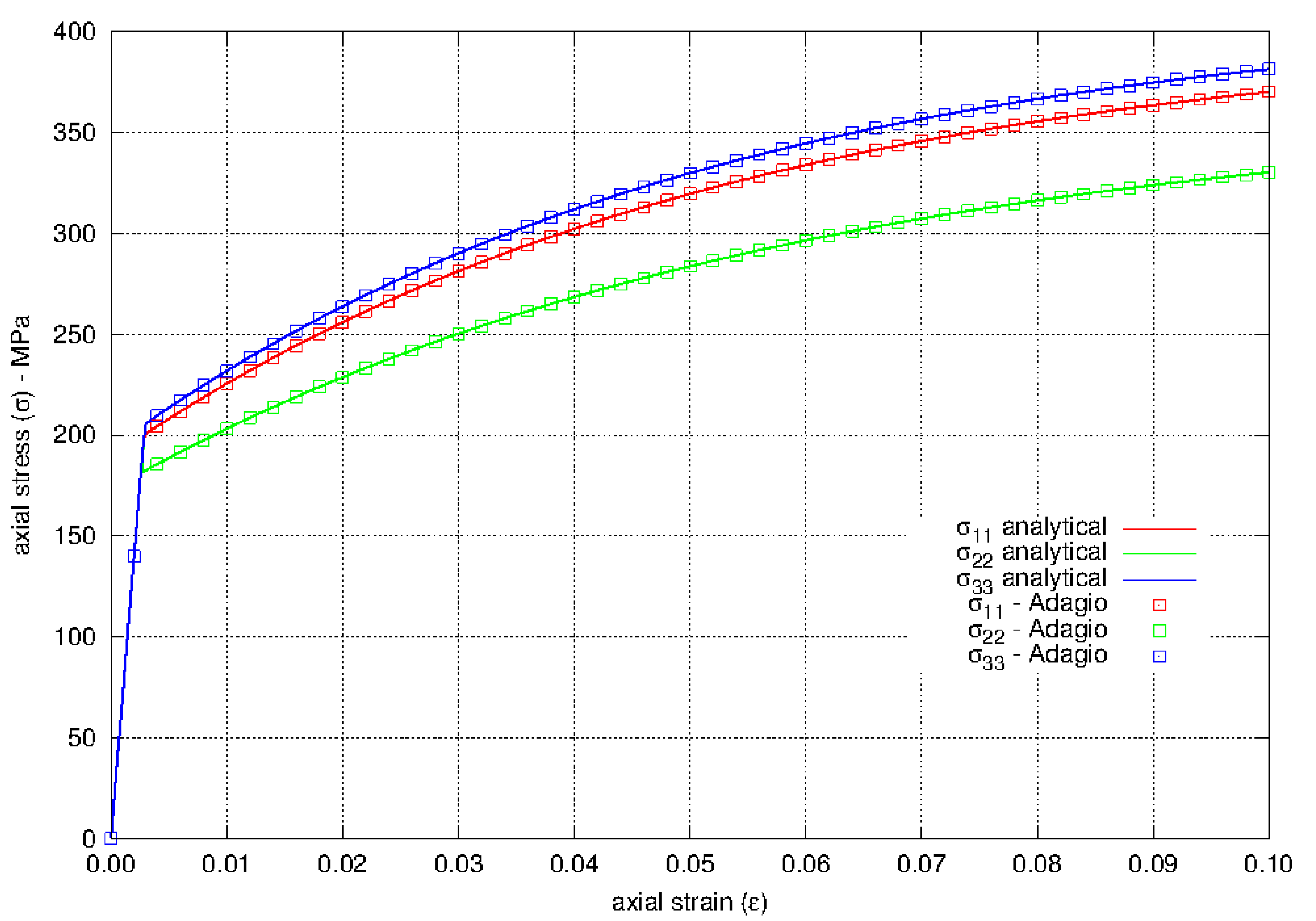 The uniaxial stress calculated by the model in Adagio is compared to analytical solutions. For uniaxial loading in the \(e_{1}\) direction, the effective stress is