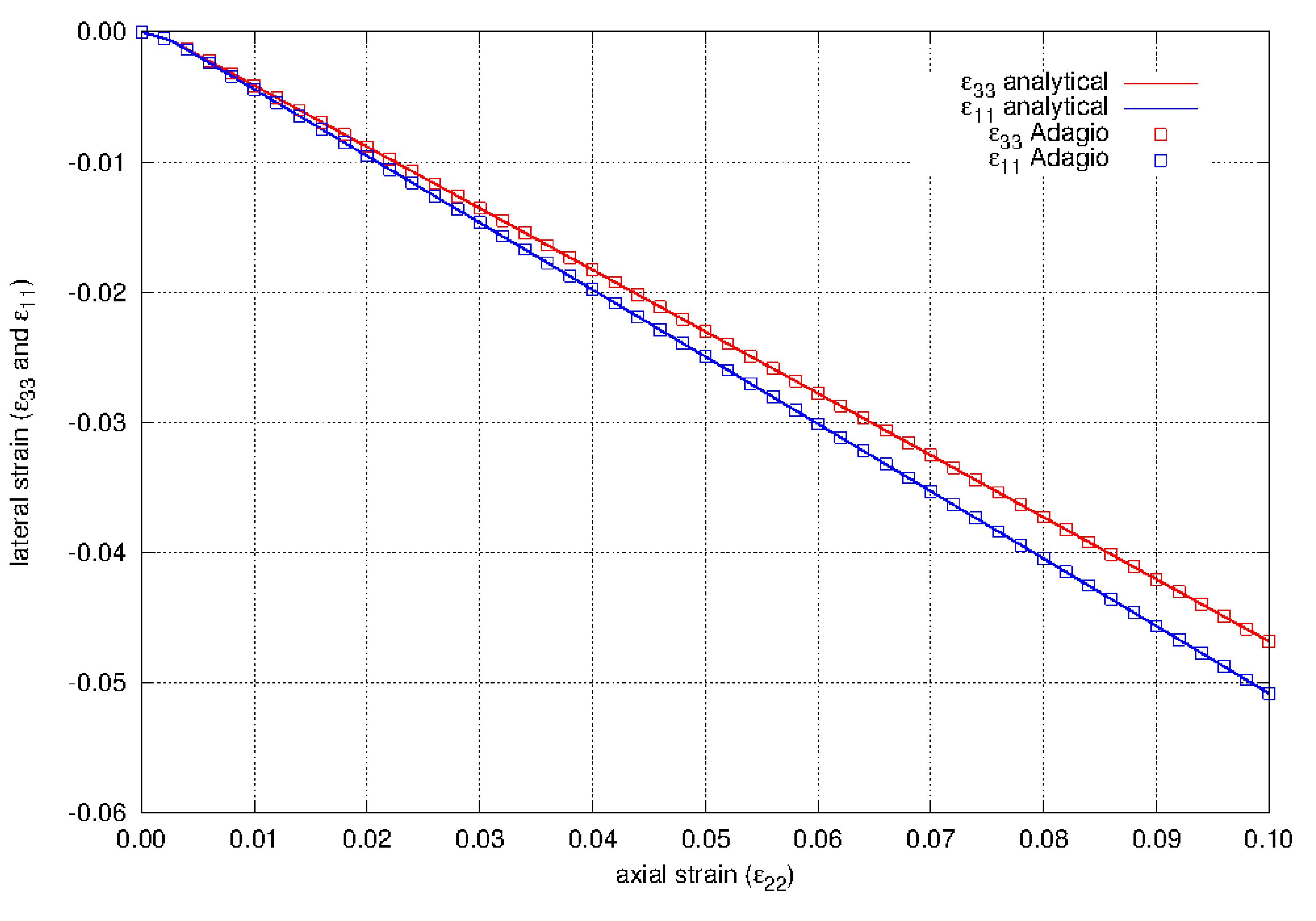 Fig. 4.62 Lateral strain as a function of axial strain for the Hill model of 2090-T3 aluminum. Loading is in the \(e_{3}\)-direction and the hardening law is a Voce law.