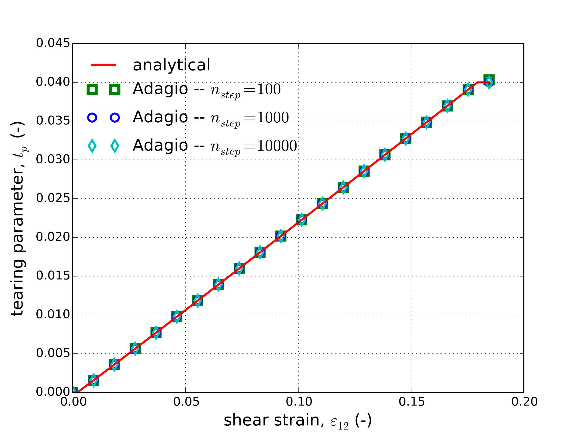 The stress then simply decays after the critical tearing parameter is reached. Numerical (from Adagio) and analytical results are presented in Fig. 4.32. Specifically, the tearing parameter and shear stress evolutions are presented in Fig. 4.32(a) and Fig. 4.32(b), respectively. Clear agreement is noted indicating the ability of the model to capture the response over a variety of loading paths.