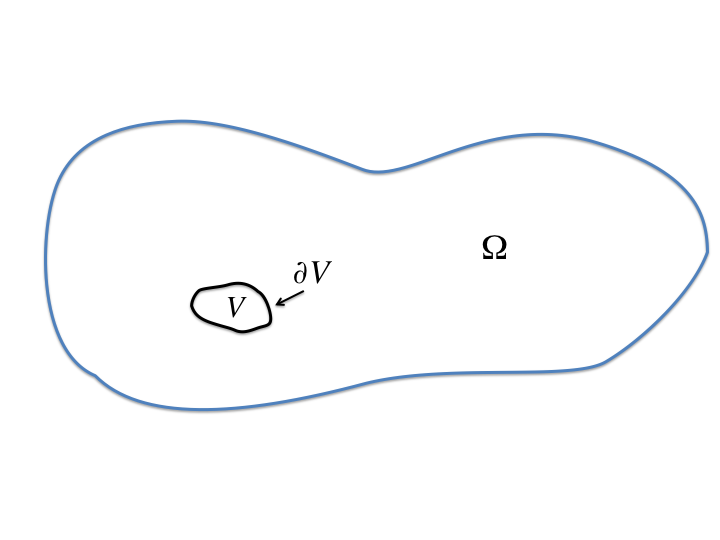 where \(f\) is some reference function, be it scalar-, vector-, or tensor-valued, defined over all of \(\Omega\). If (8.1) holds true for each and every subvolume \(V\) of \(\Omega\), then the localization theorem states that