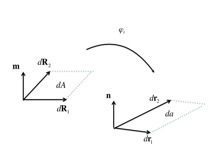 In (7.8), \(\mathrm{d}A\) is the differential reference area spanned by \(\mathrm{d}\mathbf{R}_1\) and \(\mathrm{d}\mathbf{R}_2\), and \(\mathbf{m}\) is the reference unit normal to this area.