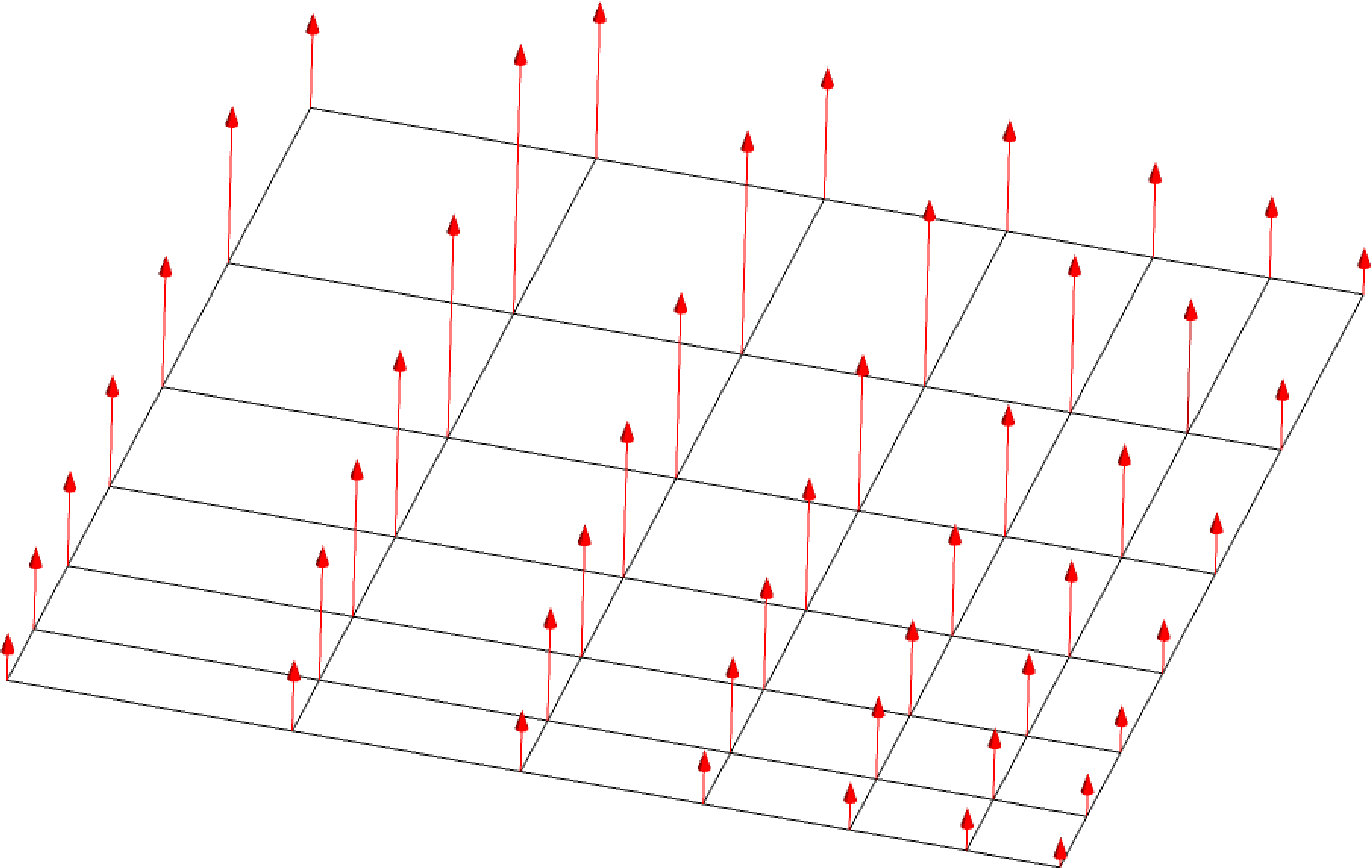 The distributed load boundary conditions are applied by defining a set of translational forces on the nodes in the application region. Generally forces will be mass proportional. Example force distributions for Z force and Z moment are shown in Fig. 7.4 and Fig. 7.5. Force distributions are constructed to apply net load in only a single component. Thus the force distribution shown in Fig. 7.4 produces no net moment on the surface and no net Force in the X and Y directions. The moment distribution shown in Fig. 7.5 produces no net force on the surface nor any net moment around the X or Y axes.