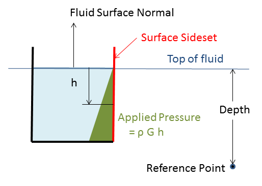 The FLUID PRESSURE command block applies a hydrostatic pressure to each node of each face in the associated surfaces. The pressure at any node is determined from