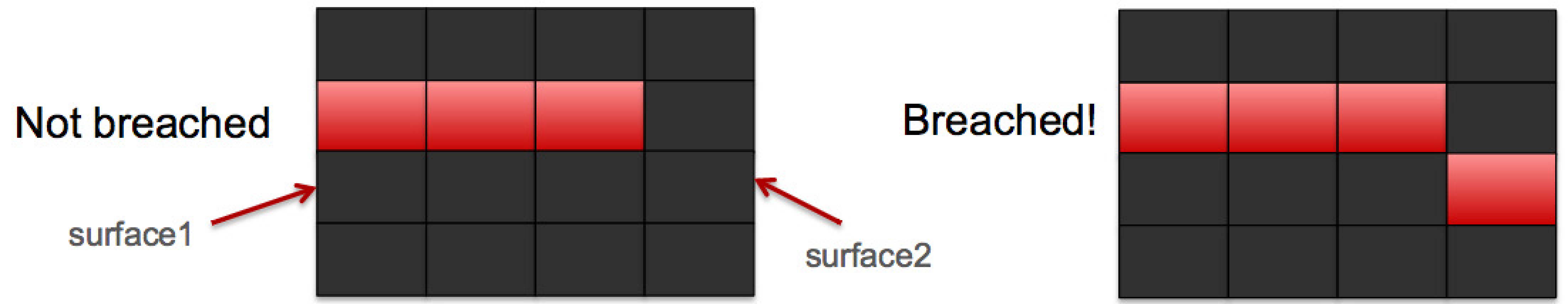 The algorithm is implemented by identifying clusters of dead elements. If two dead elements share a node, then they are considered to be in the same cluster. (An alternative implementation could consider dead elements to be in the same cluster only when they share a face; however, that is not the version currently implemented.) If a cluster of dead elements has an adjacent face in both surface_1 and surface_2, then we say breach has occurred between those surfaces (see Figure Fig. 9.17).