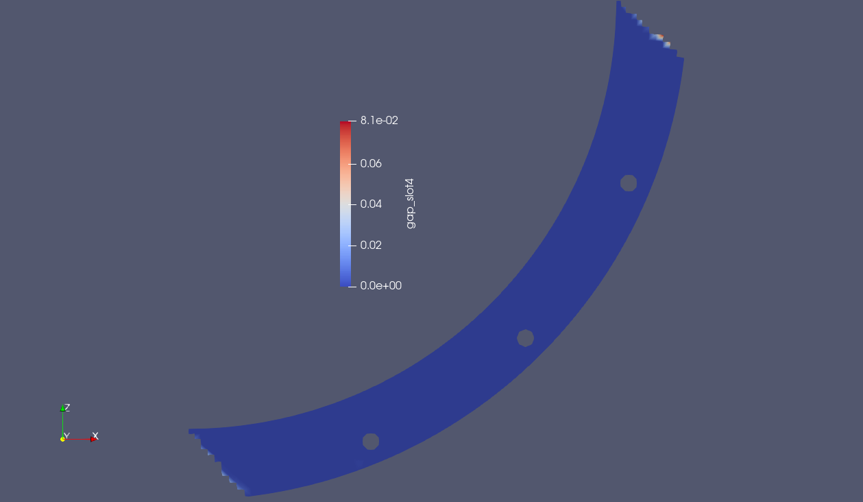 Another use case where this is required is computing the max gap across a single part; consider the case of wanting to compute the maximum gap of a cylinder being compressed. The gap is computed between the nodes of the cylinder (block_1) and the faces of the cylinder (block_1). The results of computing the closest distance can be seen in the below video.