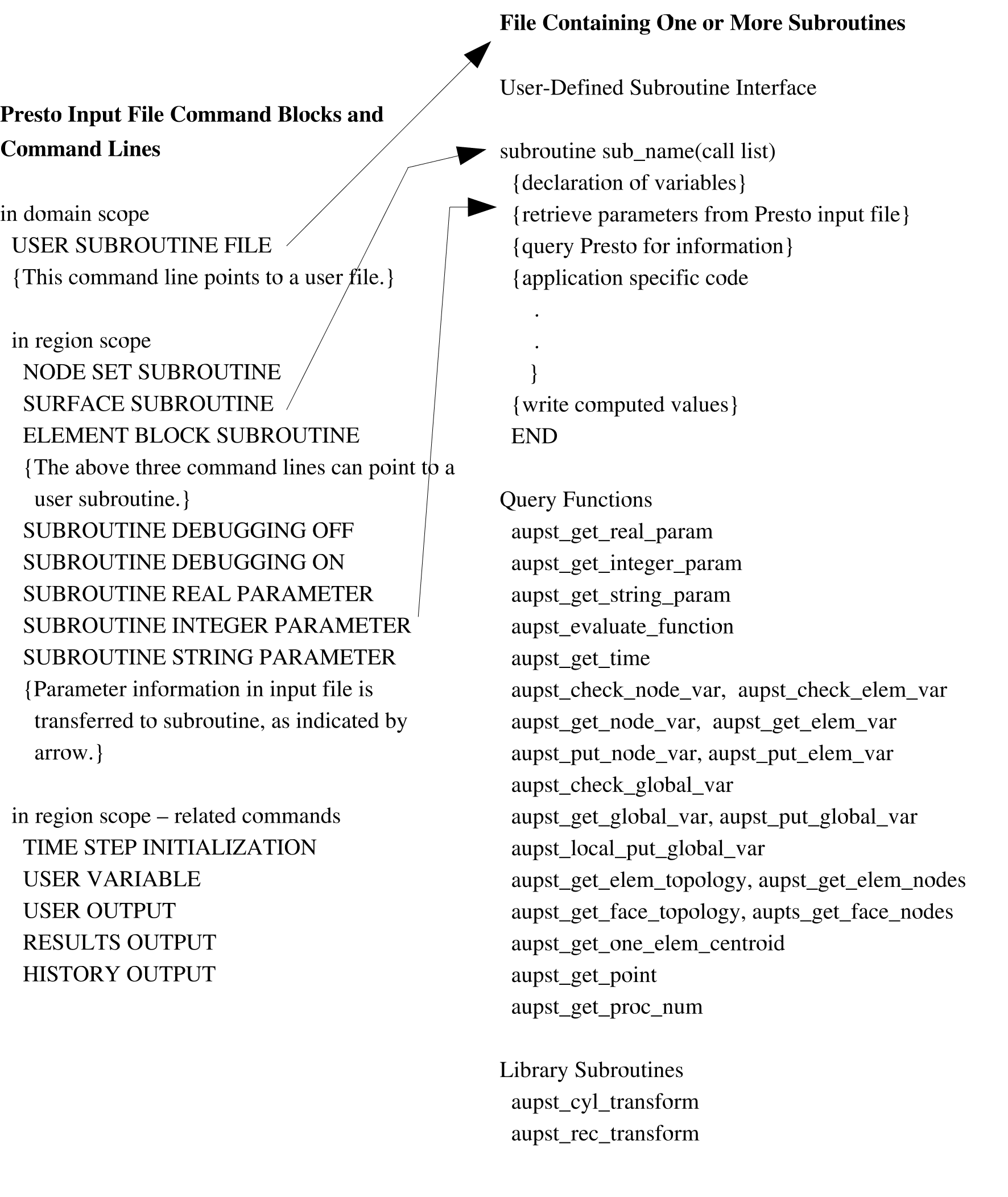 Fig. 10.1 presents a high-level overview of the various components that work together to implement the user subroutine functionality. The two main components needed for user subroutines, which are commands in the Sierra/SM input file and the actual user subroutine, are represented by the two columns in Fig. 10.1.