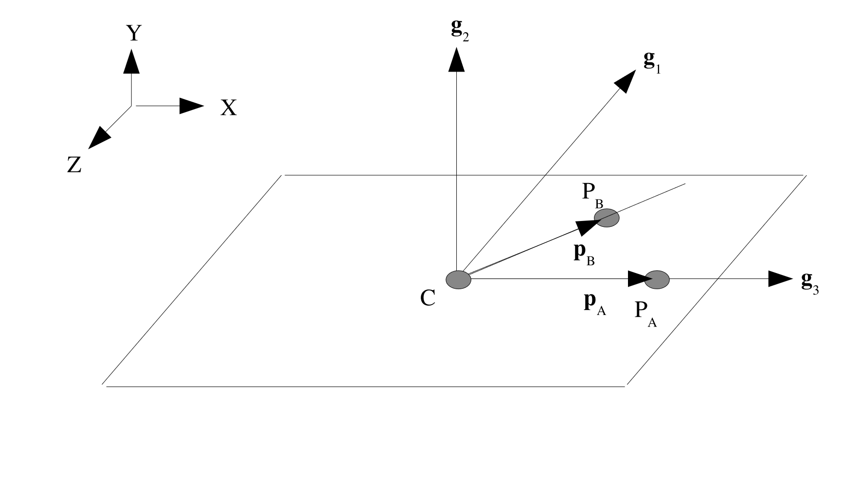 Z_RECTANGULAR: This set of basis vectors is defined similarly to theRECTANGULARsystem, however point \(P_A\) now defines a point that lies in the direction of the third basis vector, \(\mathbf{g}_3\) from the centroid of the element, see Fig. 2.5. Using the same definition for \(\mathbf{p}_A\) and \(\mathbf{p}_B\) as above we can define the three basis vectors as: \(\mathbf{g}_3 = \frac{\mathbf{p}_A}{\parallel \mathbf{p}_A \parallel}\), \(\mathbf{g}_2 = \frac{\mathbf{g}_3 \times \mathbf{p}_B}{\parallel \mathbf{g}_3 \times \mathbf{p}_B \parallel}\), \(\mathbf{g}_1 = \frac{\mathbf{g}_2 \times \mathbf{g}_3}{\parallel \mathbf{g}_2 \times \mathbf{g}_3 \parallel}\).