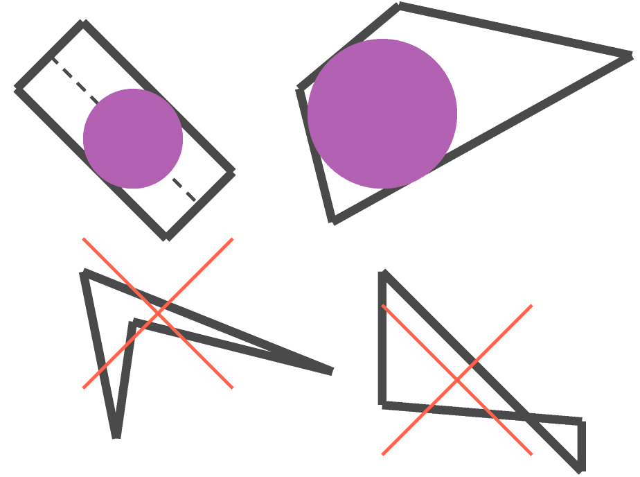 Particle conversion works with most element geometries including hexahedra, tetrahedra, shells, beams, and other particles. The converted particle is placed at the centroid of the removed element. For shells, beams and particles the new particle is placed inside of the lofted volume that the structural element represents. The mass of the particle equals the mass of the converted element. The velocity and/or temperature of the converted particle is set to the average velocity/temperature of the source element’s nodes. The radius of the converted particle is computed to allow the particle to fit inside the void space left by removal of the solid element. If no particle can fit in that space, no particle is created. This typically occurs when an element has inverted or the center of mass is not on the interior of the element, as seen in Fig. 6.28.