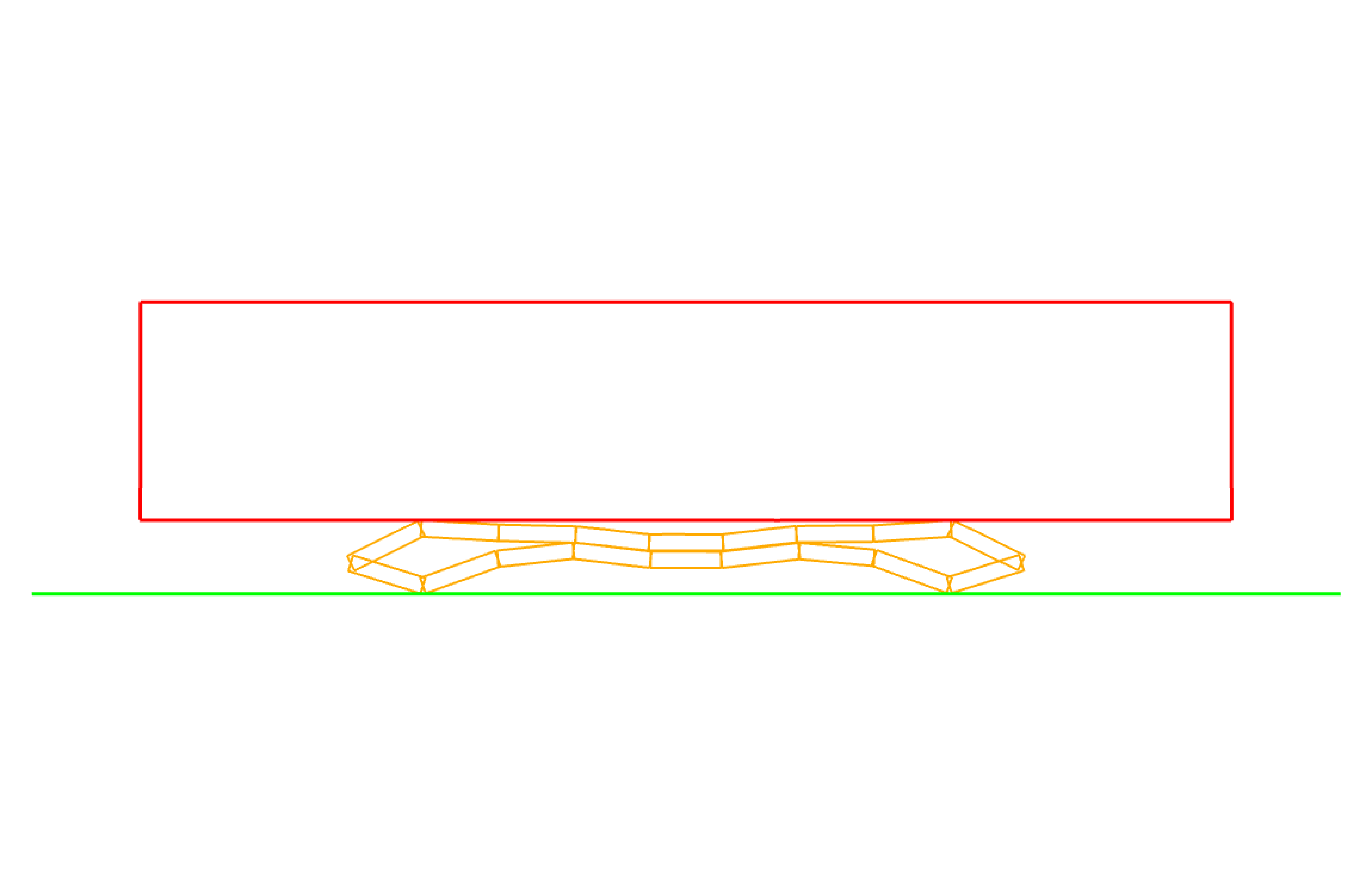 In Fig. 8.28, the bodies are shown after deformation and contact. The second image shows a cross section cut through the center. Due to the lofting of the shell surface there is a small gap between the shell elements themselves and the compressing blocks, which is expected. The actual contact geometry is shown in Fig. 8.29. Note that as block_1 is skinned, the entire exterior surface of block_1 is included in contact surface b1. The lofted geometry of the shell blocks is seen in this figure, this lofted geometry is both contacting with the blocks and experiencing self contact. Contact surface s3 contains only the top sideset on block_3, not the entire skin.
