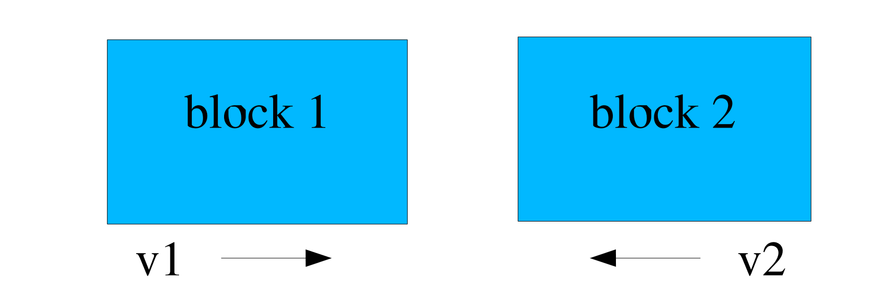 The first example problem has two blocks that come into contact due to initial velocity conditions. Block 1 has an initial velocity equal to \(v1\), and block 2 has an initial velocity equal to \(v2\). The geometric configuration for this problem is shown in Fig. 8.26.