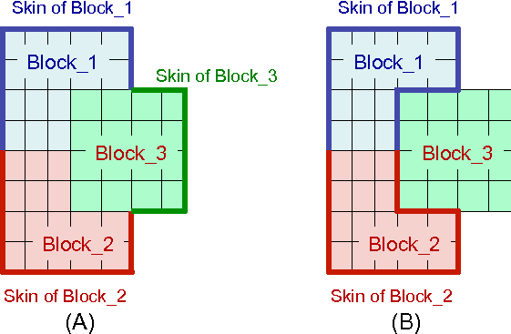 Block skinning considers only those elements actually present in the contact definition when deciding if a face is exposed. The surfaces shown by heavy lines in Fig. 8.6(A) will result from the following syntax: