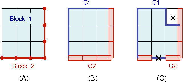 For either syntax, all the exterior facets that are connected to elements that are part of block_1 are placed in contact surface block_1. All the exterior facets that are connected to elements of block_2 are placed in contact surface block_2. Any interior facet (one that is sandwiched between two elements) is not placed in any contact surface.