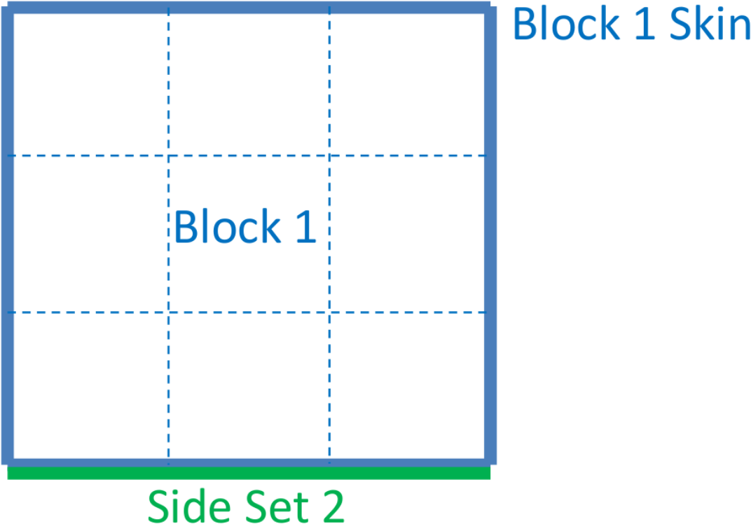 Conversely, if the SKIN ALL BLOCKS command is specified after the contact surface definition, the exterior skin will only be assigned any remaining contact surfaces once they are assigned based on the contact surface definitions. In this example, the one face on side set 2 is first assigned to surf_1. Then, the remaining 5 faces are assigned to block_1.