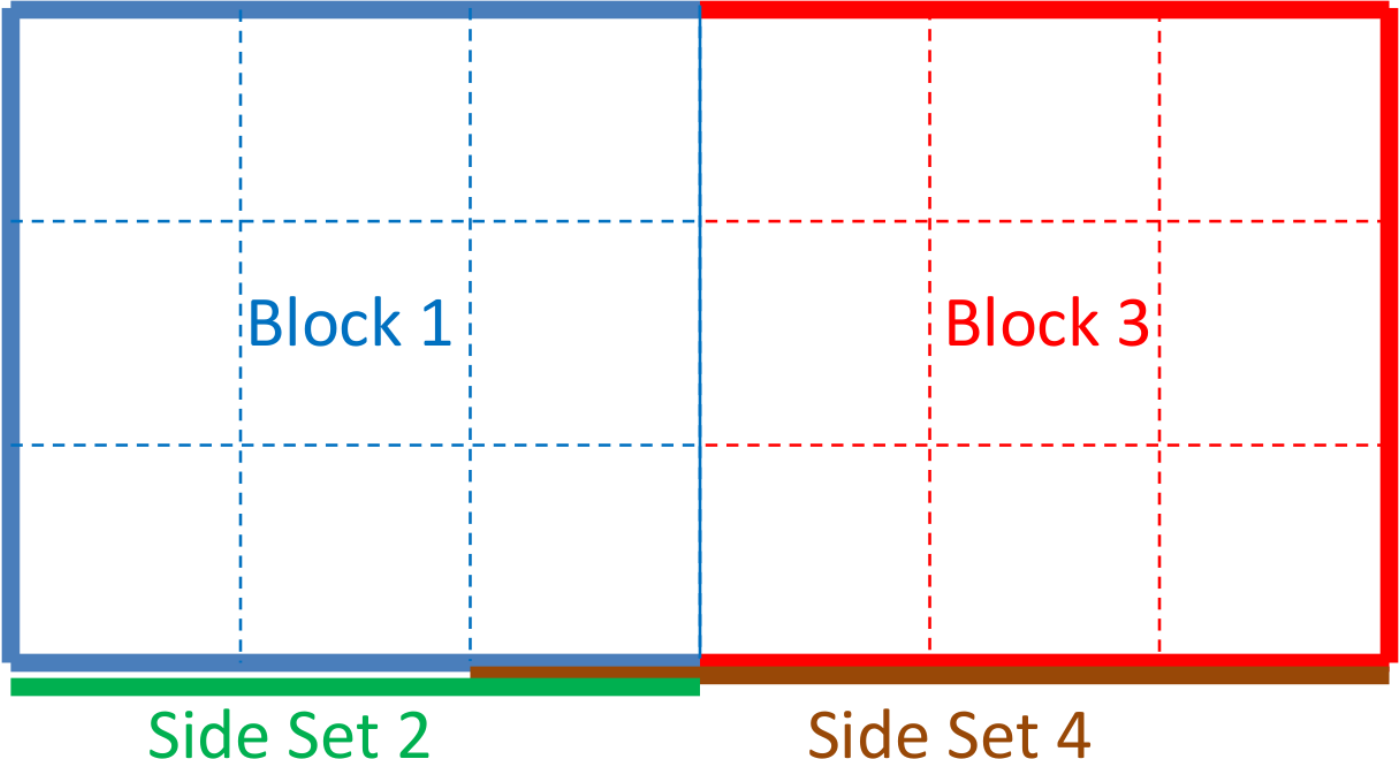 Fig. 8.7(A) shows a set of element blocks and surface sidesets as defined in a mesh file. Blocks block_1 and block_2 are equivalenced sharing nodes on their boundary. The surface surface_3 is a sideset defined on part of the exterior of block_1 and block_2. The contact surfaces shown in Fig. 8.7(B) will be generated by the following syntax: