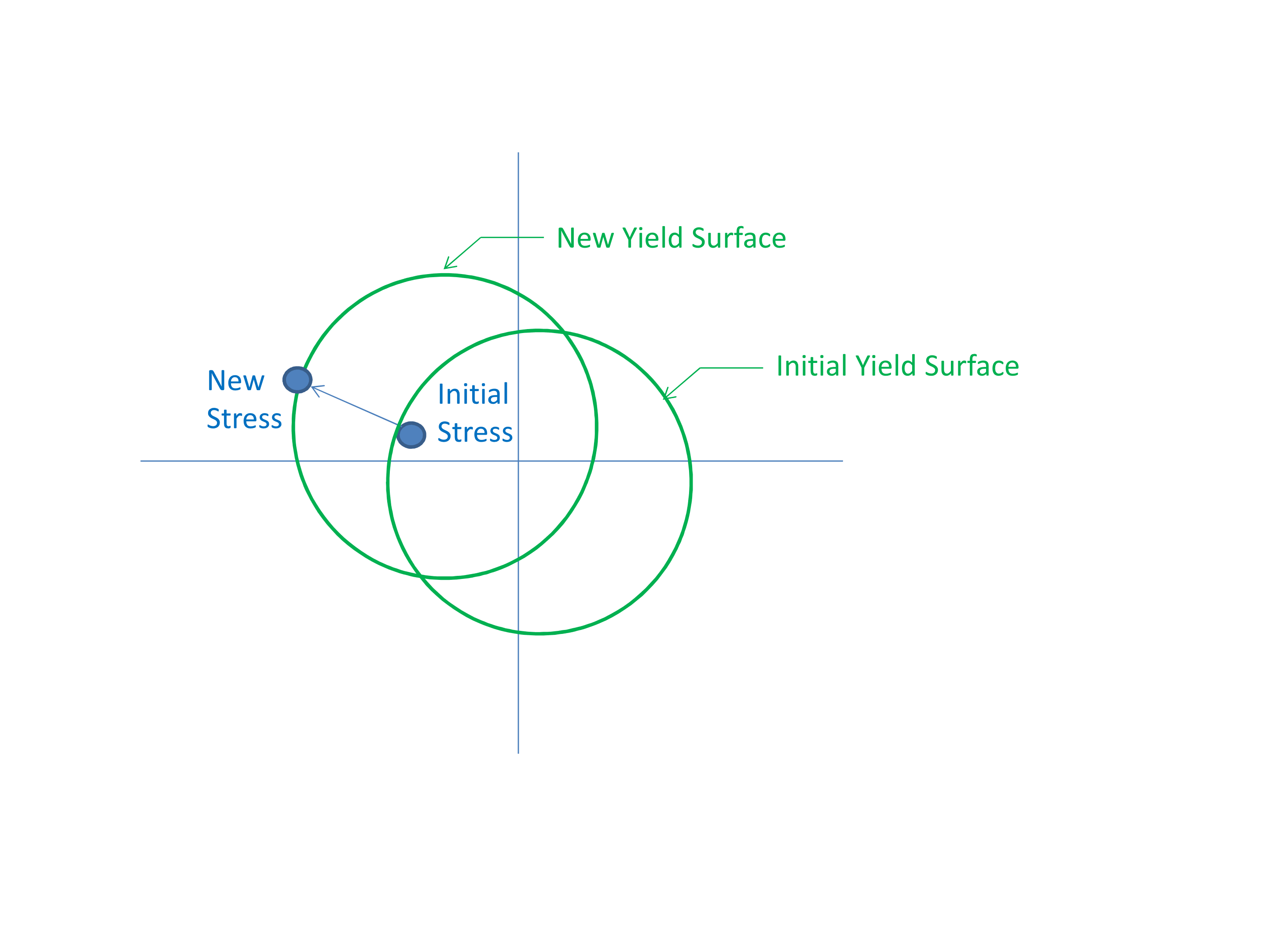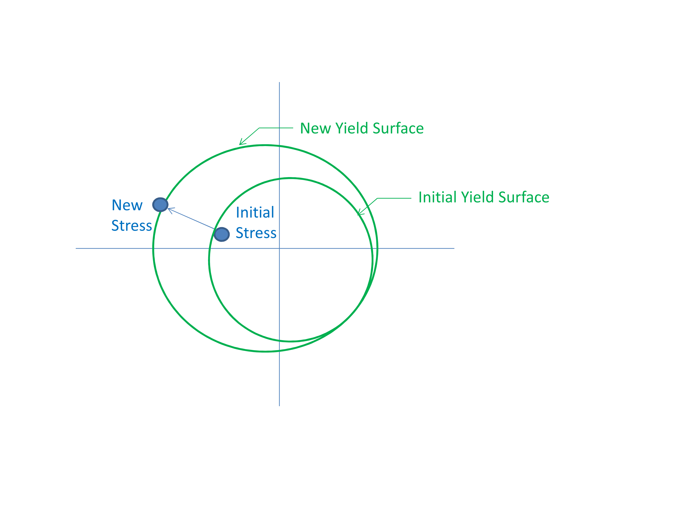 The mechanics of kinematic hardening are demonstrated in Fig. 5.2. If using pure kinematic hardening, then irrespective of the post yield hardening behavior the yield surface will never grow larger than the initial yield stress. Thus when using pure kinematic hardening the particular shape of the post yield hardening curve generally has no effect.