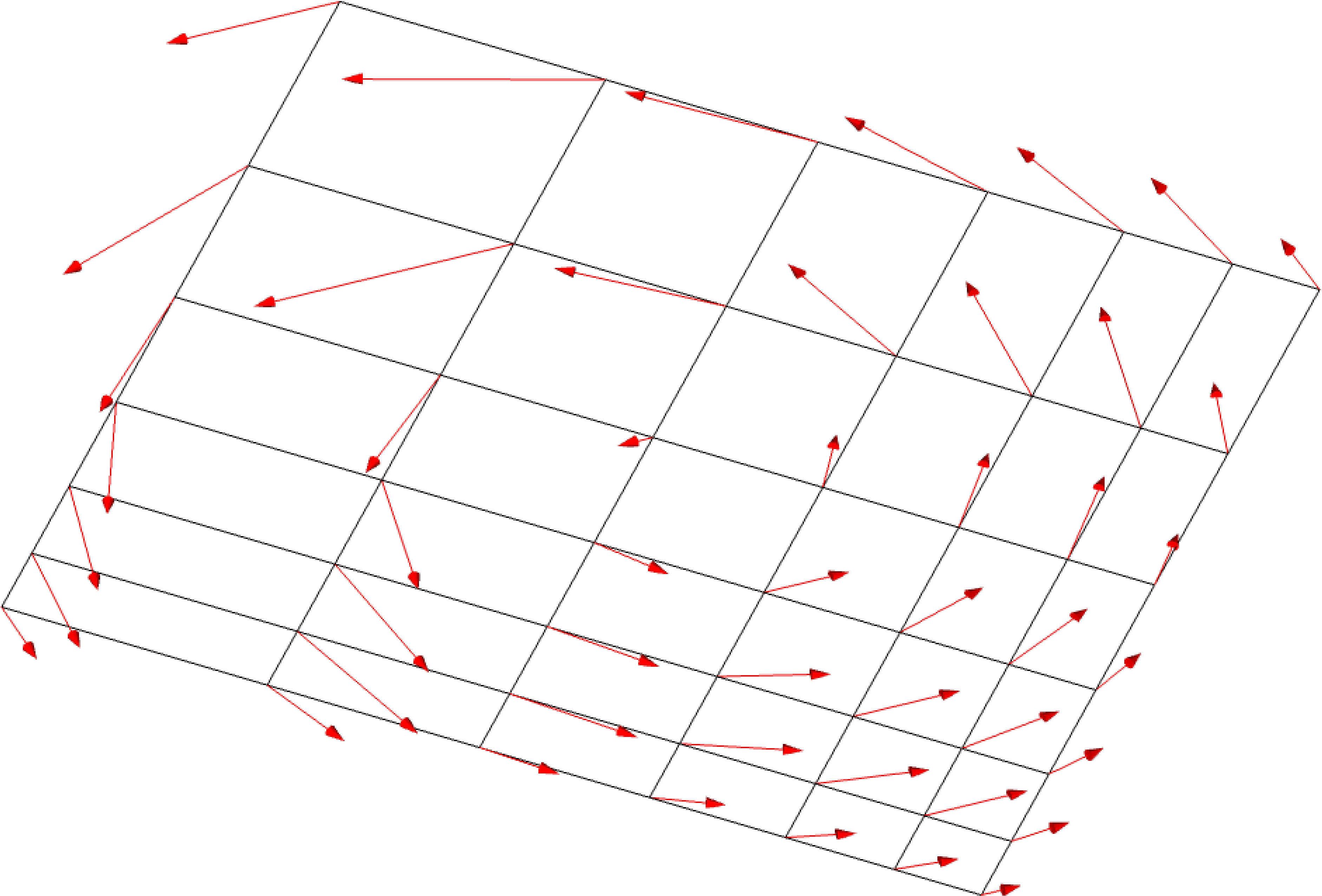The distributed load boundary conditions are applied by defining a set of translational forces on the nodes in the application region. Generally forces will be mass proportional. Example force distributions for Z force and Z moment are shown in Fig. 7.4 and Fig. 7.5. Force distributions are constructed to apply net load in only a single component. Thus the force distribution shown in Fig. 7.4 produces no net moment on the surface and no net Force in the X and Y directions. The moment distribution shown in Fig. 7.5 produces no net force on the surface nor any net moment around the X or Y axes.