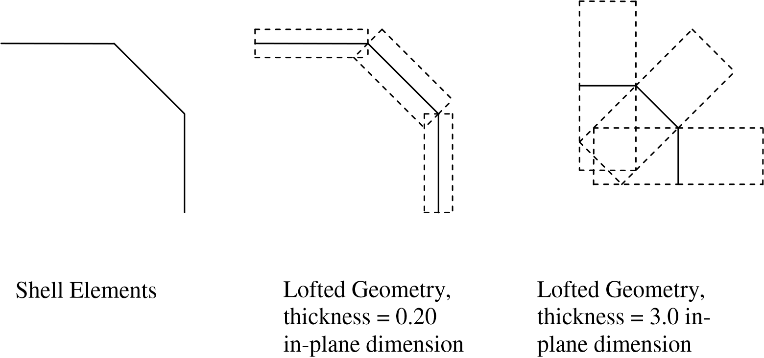 Shell elements that are thick in relation to their in-plane dimension can produce ill-defined geometries, as seen in Fig. 6.4. The LET_CONTACT_CHOOSE option can help alleviate issues related to thick or thin shells. By default, when the LET_CONTACT_CHOOSE option is used, lofted geometry thicknesses are ensured to be within 0.1–1.0 times the in-plane dimension of the shell element. If the contact-appropriate shell thickness is computed to be outside of these bounds, the lofted shell thickness will be set to the upper or lower bound as appropriate.