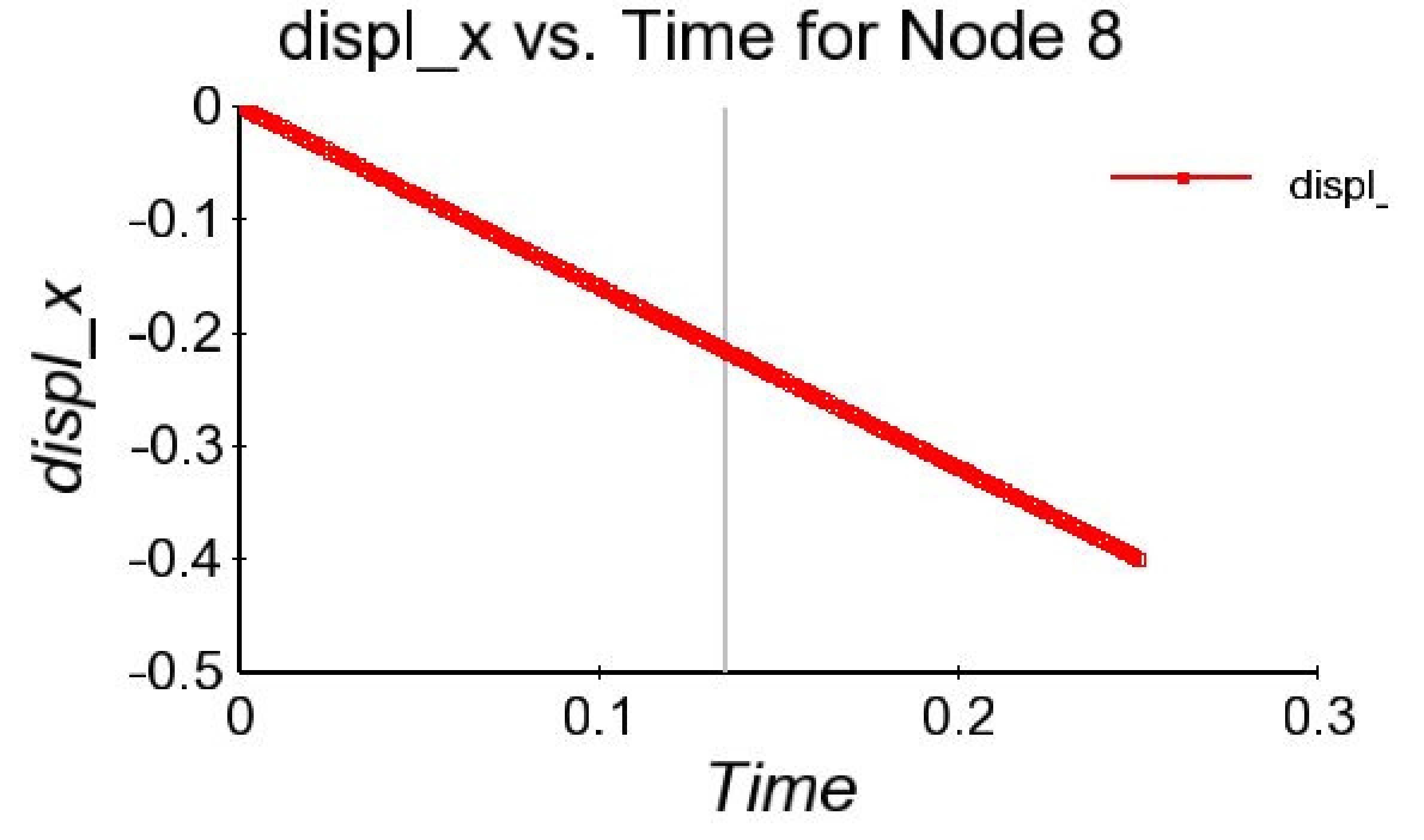 A plot of the \(x\)-displacement for node 8 (one of the nodes on the cohesive zone) over time is given in Fig. 8.13. The corresponding cohesive force in the \(x\)-direction over time for node 8 is shown in Fig. 8.14.
