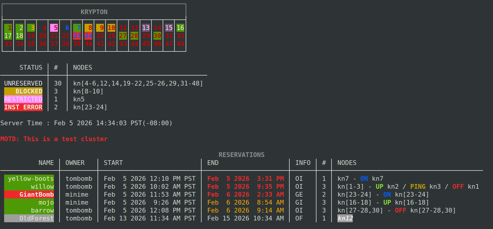 It displays the status of the cluster’s nodes along with a list of reservations. In 2.x the default reservation list only shows reservations you own or have access to via a group.