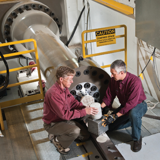 Mechanical Shock went back into operation in mid-September, and Neil and Adam Slavin (1534) say its test schedule is filling up. The facility is part of the Validation and Qualification Sciences Experimental Complex, where components are subjected to abnormal environments to make sure they will perform safely and reliably under all kinds of conditions.