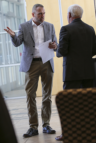 DOING BUSINESS — Sandia small-business advocate Eric Lochausen talks to a potential supplier at a recent open house. “People want to meet with us, and it can be difficult to schedule time,” he says. “We thought it would be better to set up specific hours where we can devote our attention to small, diverse suppliers.” (Photo by Lonnie Anderson)