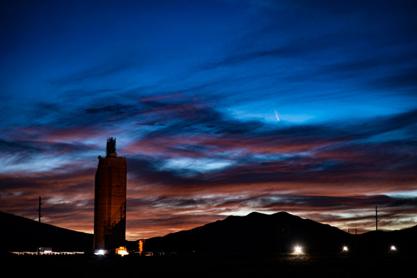 SPACE TRAVELER — Labs Photojournalist Randy Montoya made a very early morning trek out to Sandia’s Solar Tower to capture this image of the NEOWISE Comet, named after NASA’s space telescope, Near-Earth Object Wide-field Infrared Survey Explorer, which first spotted the comet in late March. NEOWISE will continue on its orbit of the outer solar system, leaving Earth’s view in August and not returning again for 6,800 years.