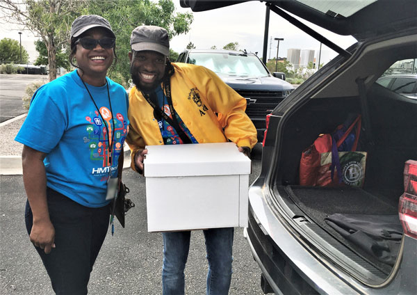 SUMMER OUTREACH — Tineca Quintana and Joshua James distributed kits to families participating in education outreach this summer. Sandia’s Black Leadership Committee hosted the virtual Hands-On Minds-On Technologies Summer Youth Program on Saturdays in June for 50 middle and high school students. The program included volunteer and mentorship opportunities for employees and students in fun, hands-on science and engineering activities. Participants learned about the electromagnetic spectrum, chemistry, a circuit playground and a variety of STEM careers. (Photo by Cheryl Garcia)