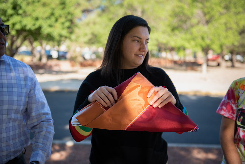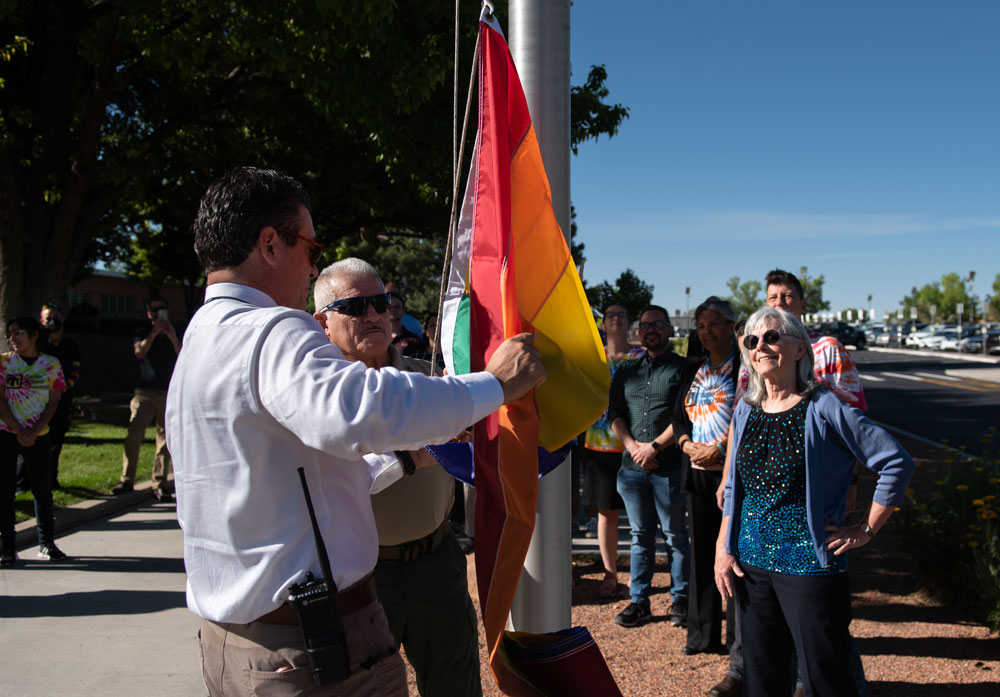 PASS THE FLAG — Mary Guth, a board member of the Sandia Pride Alliance Network, passes a Pride flag along a chain of staff members before it is raised.
