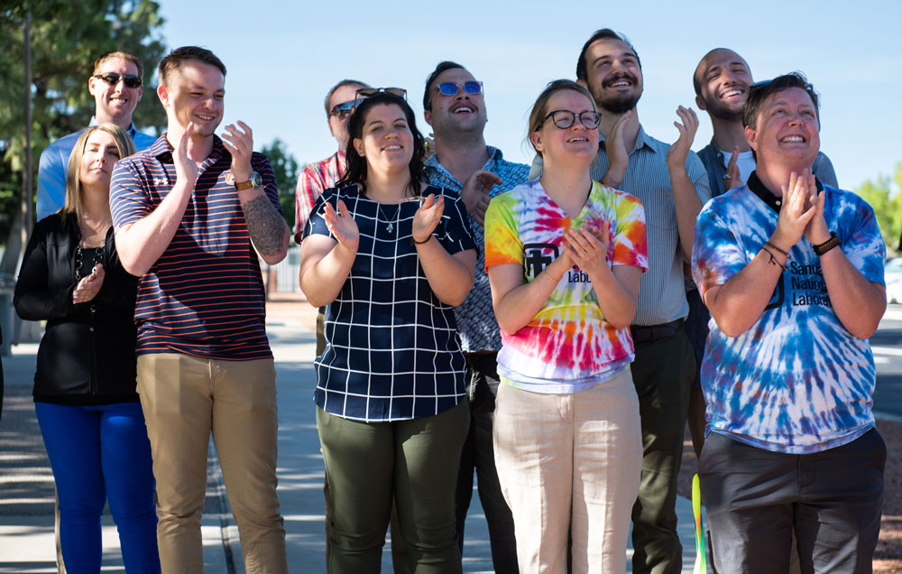 PRIDEFUL APPLAUSE — Sandia staff members applaud as the Pride flag is raised in front of Building 800 in honor of Pride Month.
