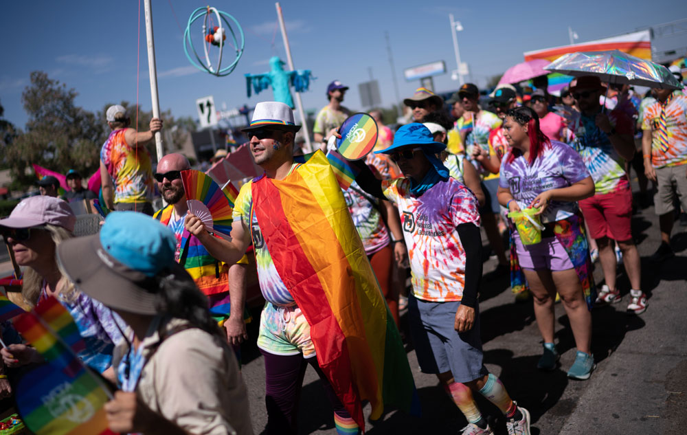 PRIDEFEST — Los Alamos National Laboratory health physics coordinator Tom Shereck, left with flag, walks with Sandians during the parade.