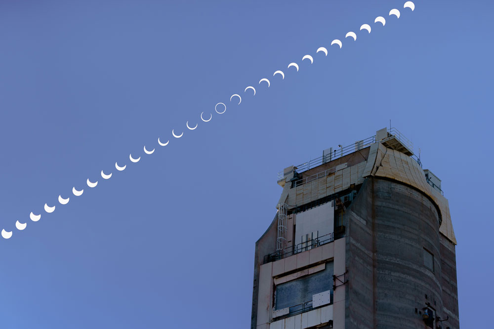 Phases of the annular solar eclipse are shown as it passes Sandia’s National Solar Thermal Test Facility in Albuquerque on Oct. 14. The first photograph includes multiple exposures as the sun and moon traveled left to right, as well as an exposure without the eclipse.