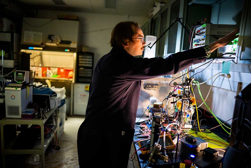 OUT-OF-THE-BOX-THINKING — Alex Hare works on testing a device that Sandia and research partner Know Biological are developing to warn the wearer before the onset of an epileptic seizure. Alex is part of a team that was awarded an R&D 100 Award for their work, made possible by trying new approaches to solve problems. (Photo by Craig Fritz)