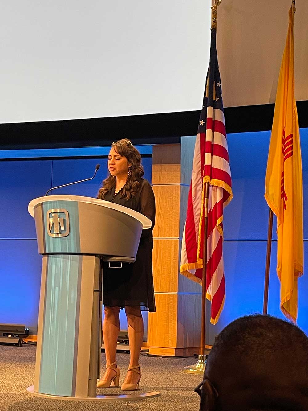 PRAYERS FOR THE NATION — Sandia’s Lissette Carter opens the National Day of Prayer event by singing the national anthem on May 2 at Steve Schiff Auditorium. The Christians in the Workplace Networking Group and the Kirtland Air Force Base Chaplain Corps co-sponsored the event. Lissette was one of 11 people who led different portions of the assembly. More than 200 people from Sandia New Mexico and California attended in person and virtually. (Photo courtesy of Jeff Gruda)