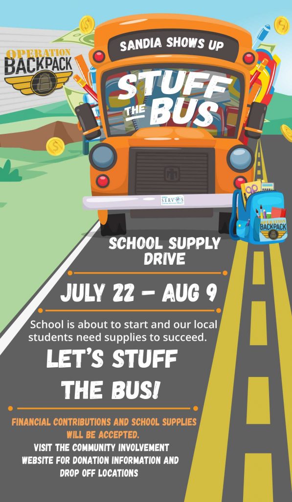 Sandia is currently in the midst of its annual Stuff the Bus School Supply Drive in New Mexico, which kicked off on July 22 and runs through Aug. 9. California just wrapped up its own Operation Backpack on July 25.