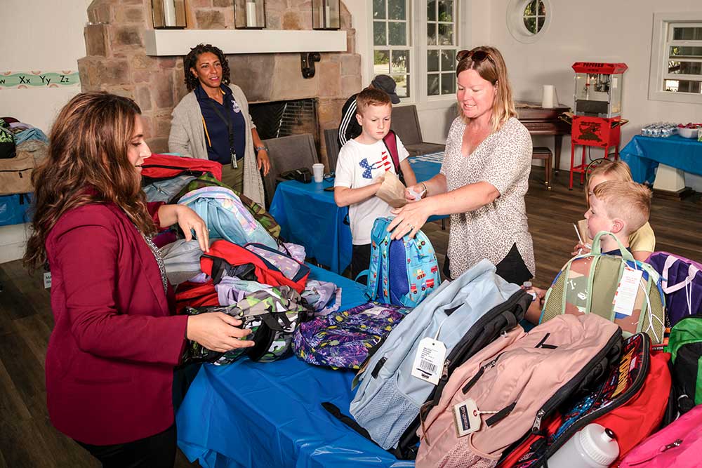 BACK TO SCHOOL — From left, Sandia senior management assistant Melissa Mercier and Camp Parks employee Liliam Cordoba distribute backpacks full of school supplies to military families during the Operation Backpack event in California on Aug. 6. Sandians donated 225 backpacks to families at Camp Parks in Dublin and Moffett Airfield in Mountain View, California. (Photo by Randy Wong)