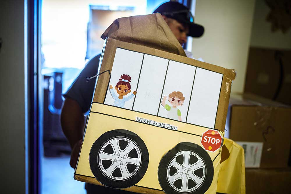 CLASSROOM READY — Logistics team member Ely Anaya carries one of many boxes of donated school supplies into Moriarty-Edgewood District Schools on Aug. 14. Through Stuff the Bus and Operation Backpack initiatives, Sandians in New Mexico donated $8,500 plus school supplies that were delivered to schools in Albuquerque, Los Lunas and Moriarty-Edgewood. (Photo by Craig Fritz)